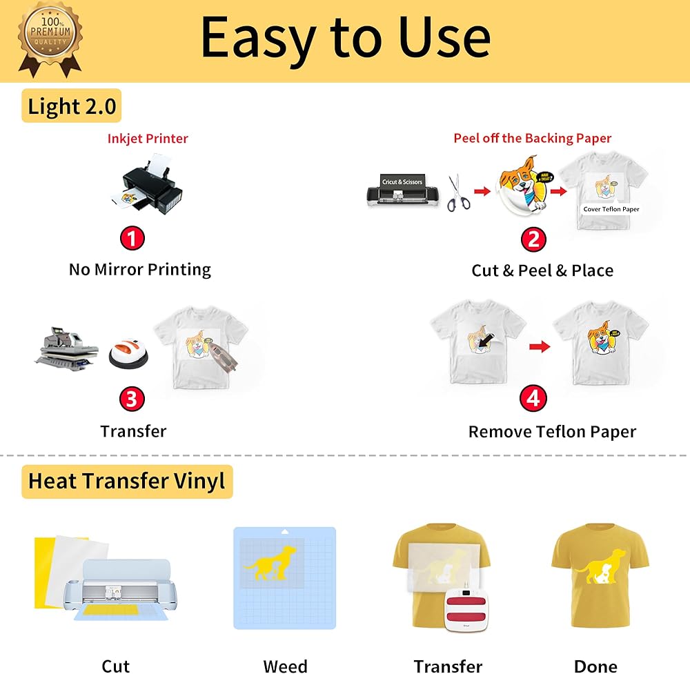 💕سهلة الاستخدام: [1] قم بطباعة الصورة وقصها. [2] قم بتقشير الصورة المطبوعة ووضعها متجهًا للأعلى على القماش ثم قم بتغطية الصورة بورق التيفلون. [3] انقل الصورة باستخدام المكواة أو الضغط الحراري. [4] قم بإزالة ورق التيفلون. تم النقل! توجد تعليمات خطوة بخطوة على الجزء الخلفي من ورق الغلاف في العبوة. يوجد فيديو تعليمي في قسم مقاطع الفيديو بهذه الصفحة للرجوع إليه.