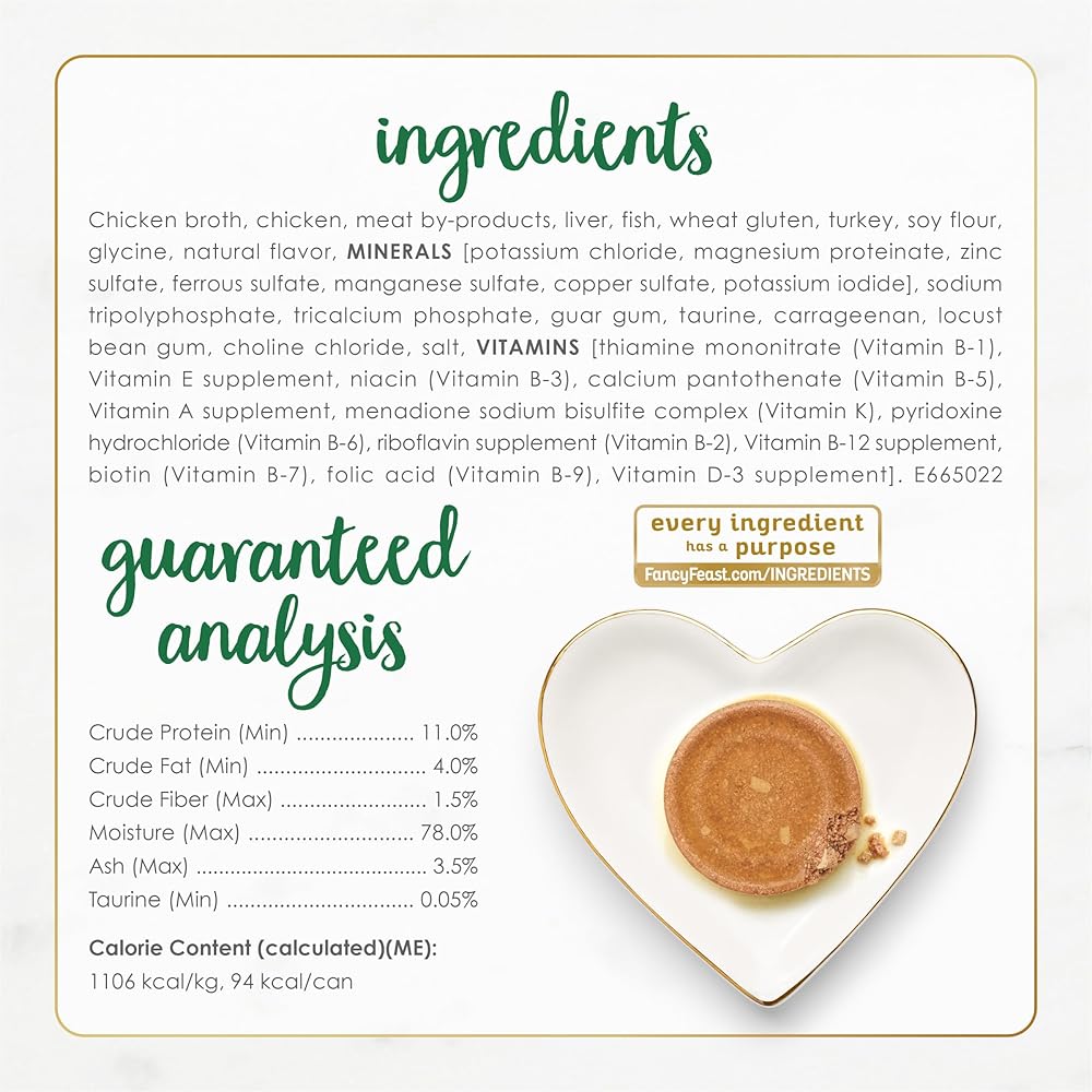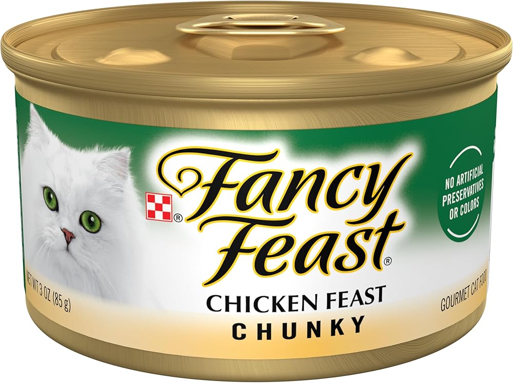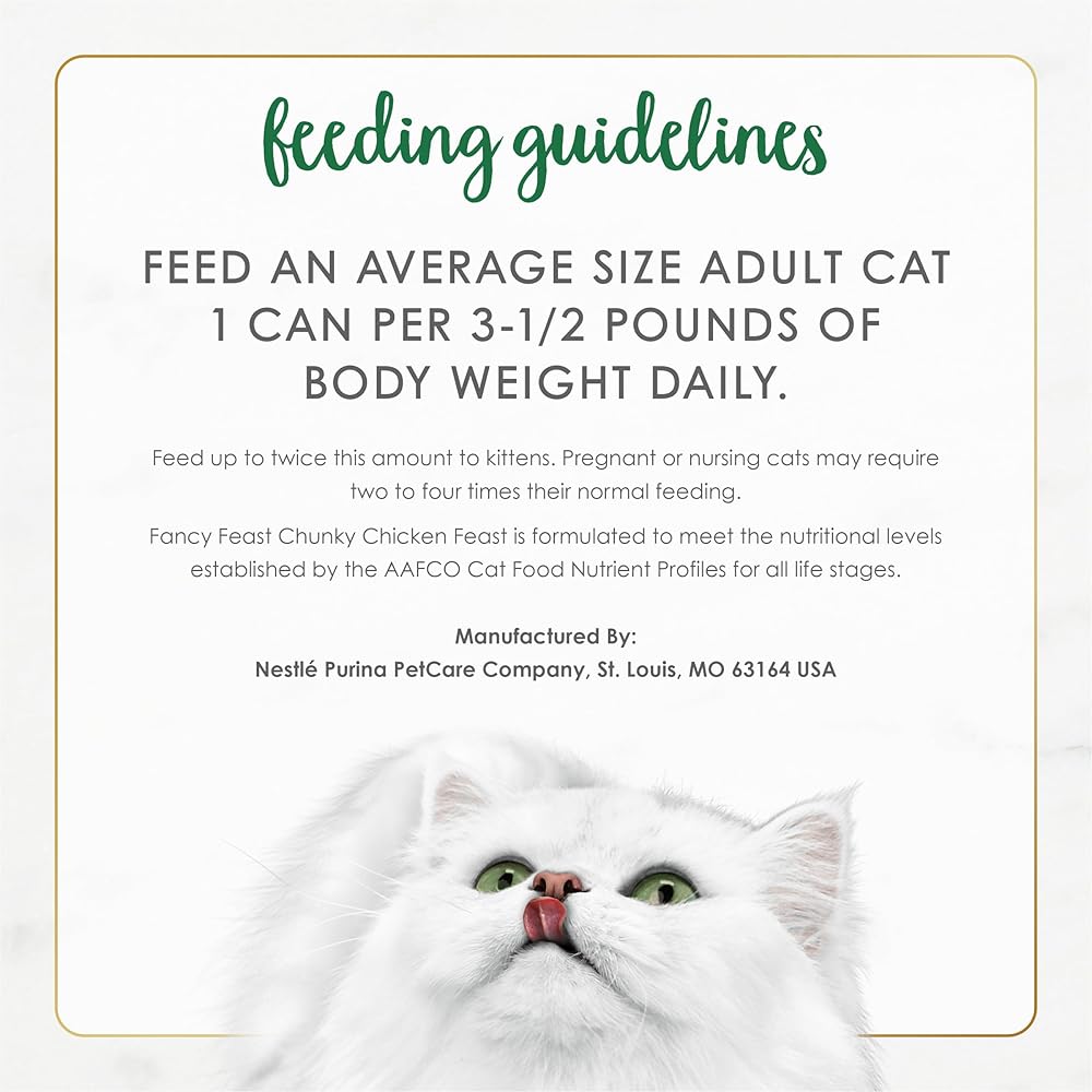 Entice your cat with the tempting taste of poultry when you serve Purina Fancy Feast Chunky Chicken Feast wet cat food. Tender chunks of chicken surrounded in a finely ground pate provide a palate-pleasing combination of textures your cat is sure to love, and the high-quality ingredients in this grain-free cat food deliver an exceptional level of taste in every mouthwatering bite. With its appealing appearance, this gourmet wet cat food keeps your cat engaged during feedings. Essential vitamins and minerals help to support her overall health and wellness, so you can feel good about the foods you put in her dish. Make mealtime a special time you share with your cat when you fill her dish with this delectable wet cat food and let her explore our other Fancy Feast Chunky recipes, including Turkey Feast and Chopped Grill Feast, to give her delicious choices at mealtime. Don't make her wait for dinner. Get her food to her fast when you order Purina Fancy Feast from Amazon.com now.