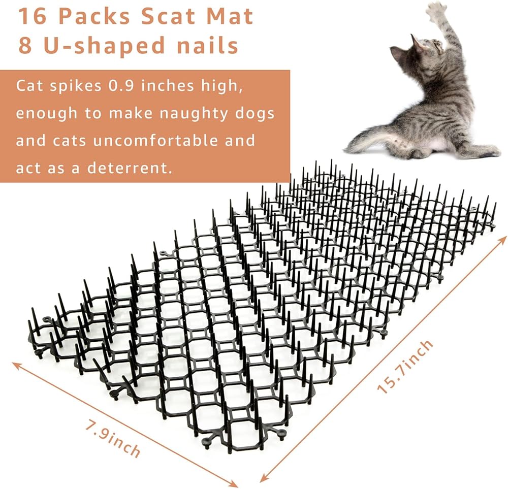 المواصفات - سوف تحصل على 16 سجادة للقطط، كل سجادة ذات مسامير للقطط بقياس 15.7 × 7.9 × 0.9 بوصة ومجهزة بـ 8 أظافر على شكل حرف U، حتى تتمكن من تغطية أي منطقة بأشواك القطط لإبقاء الكلاب بعيدًا عن الأريكة أو بالخارج، والحفاظ عليها أبعد القطط عن النباتات المحفوظة بوعاء، وأبعد القطط عن الفناء إلى الأبد.