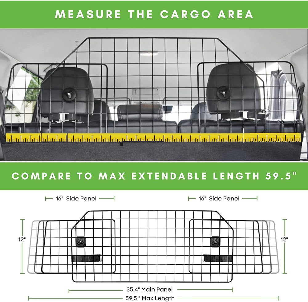 ملاءمة عالمية وقابلة للتعديل بالكامل: حاجز للحيوانات الأليفة للكلاب مصمم ليناسب المقاس. يمتد طوله حتى 59.5 بوصة لتغطية منطقة الشحن في كل مركبة بشكل صحيح مع مسند رأس قابل للتمديد. يبلغ حجم اللوحة الرئيسية 35.4 بوصة (طول) × 16.5 بوصة (ارتفاع) بينما يبلغ حجم الألواح الجانبية 12 بوصة (ارتفاع) × 16.5 بوصة (طول).