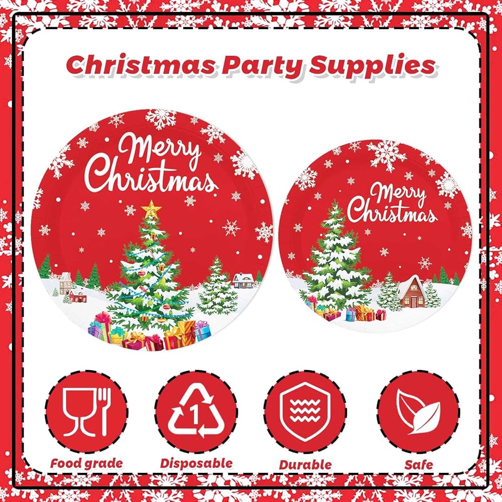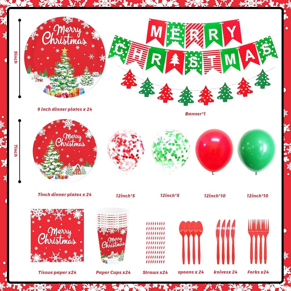 مجموعة حفلات عيد الميلاد المجيد: تتضمن مجموعة حفلات عيد الميلاد الخاصة بنا كل ما تحتاجه لحفلة عيد الميلاد الرائعة، بما في ذلك 24 قطعة 7 في أطباق الحلوى؛ 24 قطعة من أطباق العشاء الورقية مقاس 9 بوصات؛ 24 قطعة من الأكواب الورقية؛ 24 قطعة من المناديل الورقية؛ 24 قطعة من الشوك البلاستيكية؛ 24 قطعة من السكاكين البلاستيكية؛ 24 قطعة من الملاعق البلاستيكية؛ 24 قطعة من القش؛ قطعة واحدة مكتوب عليها لافتة عيد الميلاد المجيد، قطعة واحدة لافتة شجرة عيد الميلاد باللونين الأحمر والأخضر، 30 قطعة بالونات؛ مساعدتك في استضافة الحفلات بكل سهولة