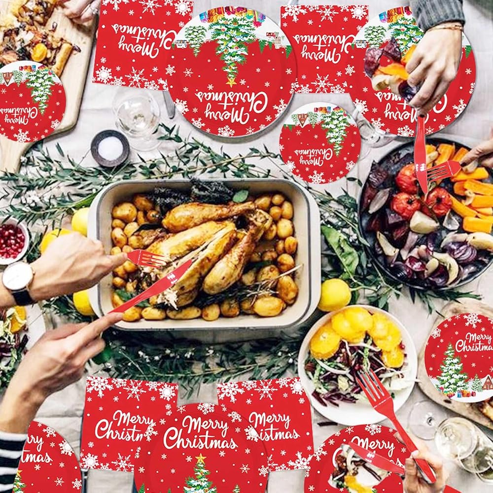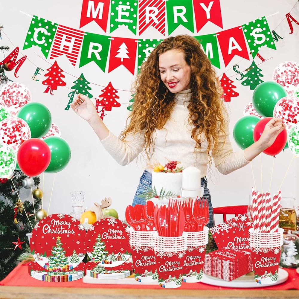 زخارف أواني طعام ورقية لعيد الميلاد الشتوي من MEHOFOND، لافتة ورقية لعيد الميلاد المجيد مع بالونات، لوازم حفلات حمراء للاستعمال مرة واحدة، أطباق حفلات عيد الميلاد، مستلزمات أكواب المناديل، خدمة 24