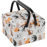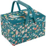 Large, rectangular, twin-lidded sewing box covered in cotton fabric. With hand stitched felt embellishments and embroidery. PVC double handles. Hard plastic internal tray with compartments for sewing accessories. Internal pocket and pincushion inside lid. Spot clean only.