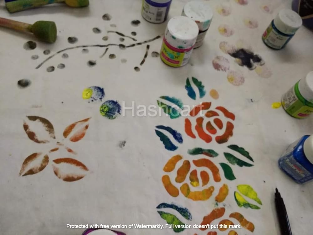 تعليمات الاستخدام - قم بإعداد القماش أو السطح الذي تريد طباعته. قم بتوزيع اللون على الكتل لطباعة الكتل باستخدام قطعة إسفنجية ثم ضع طوابع سجل القصاصات على الجسم الخاص بك