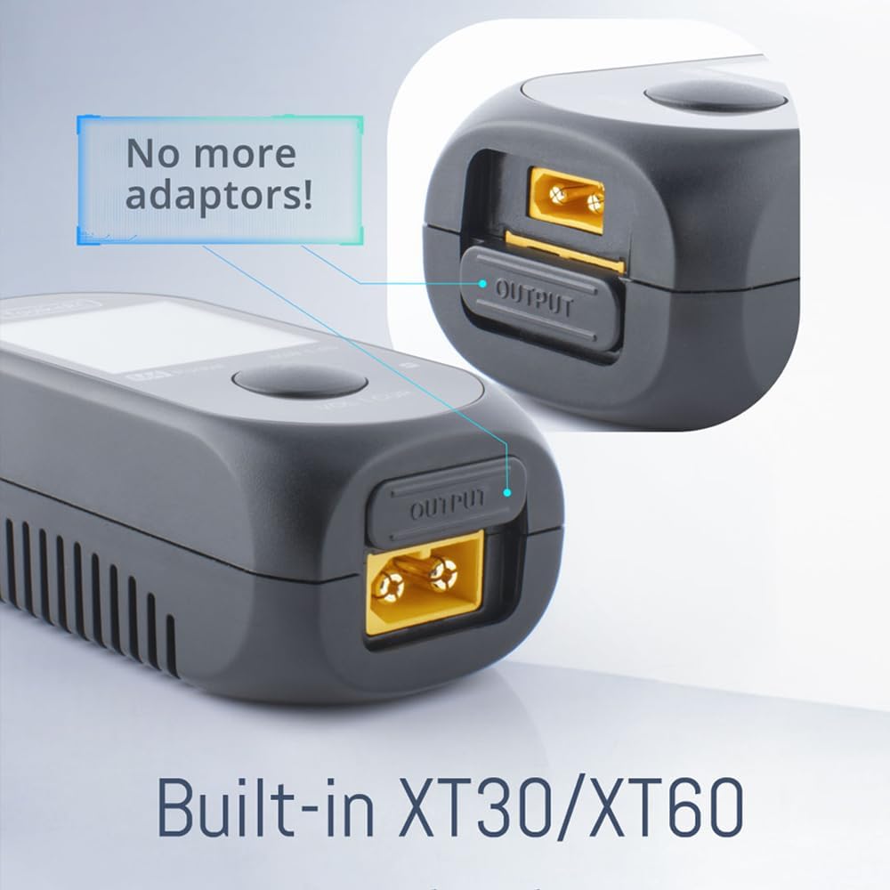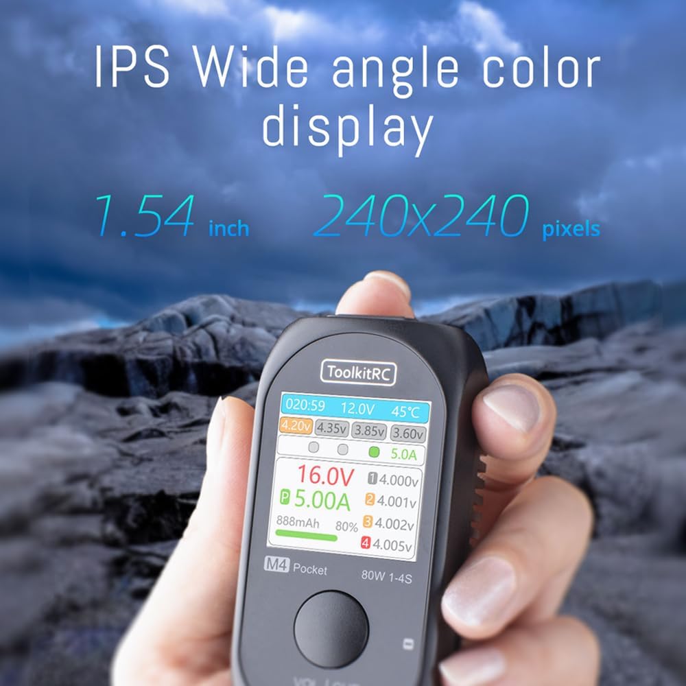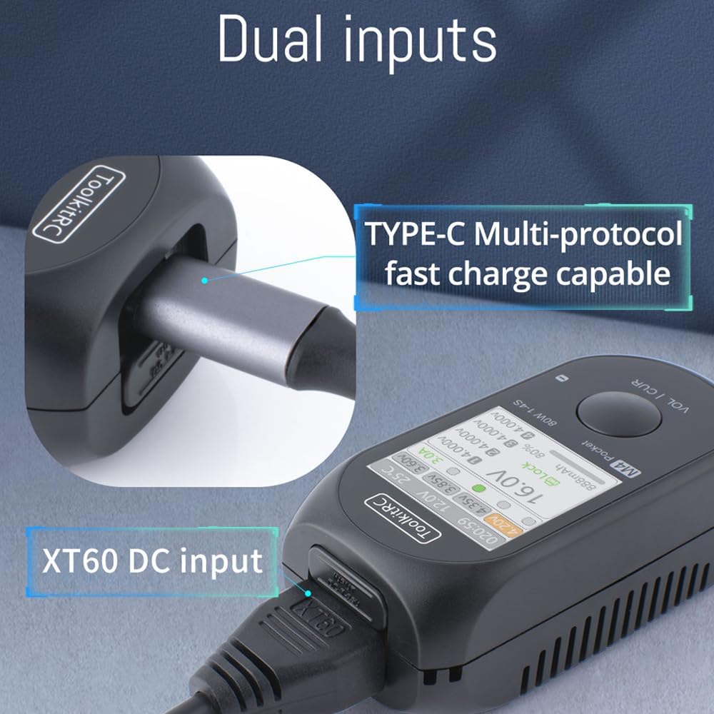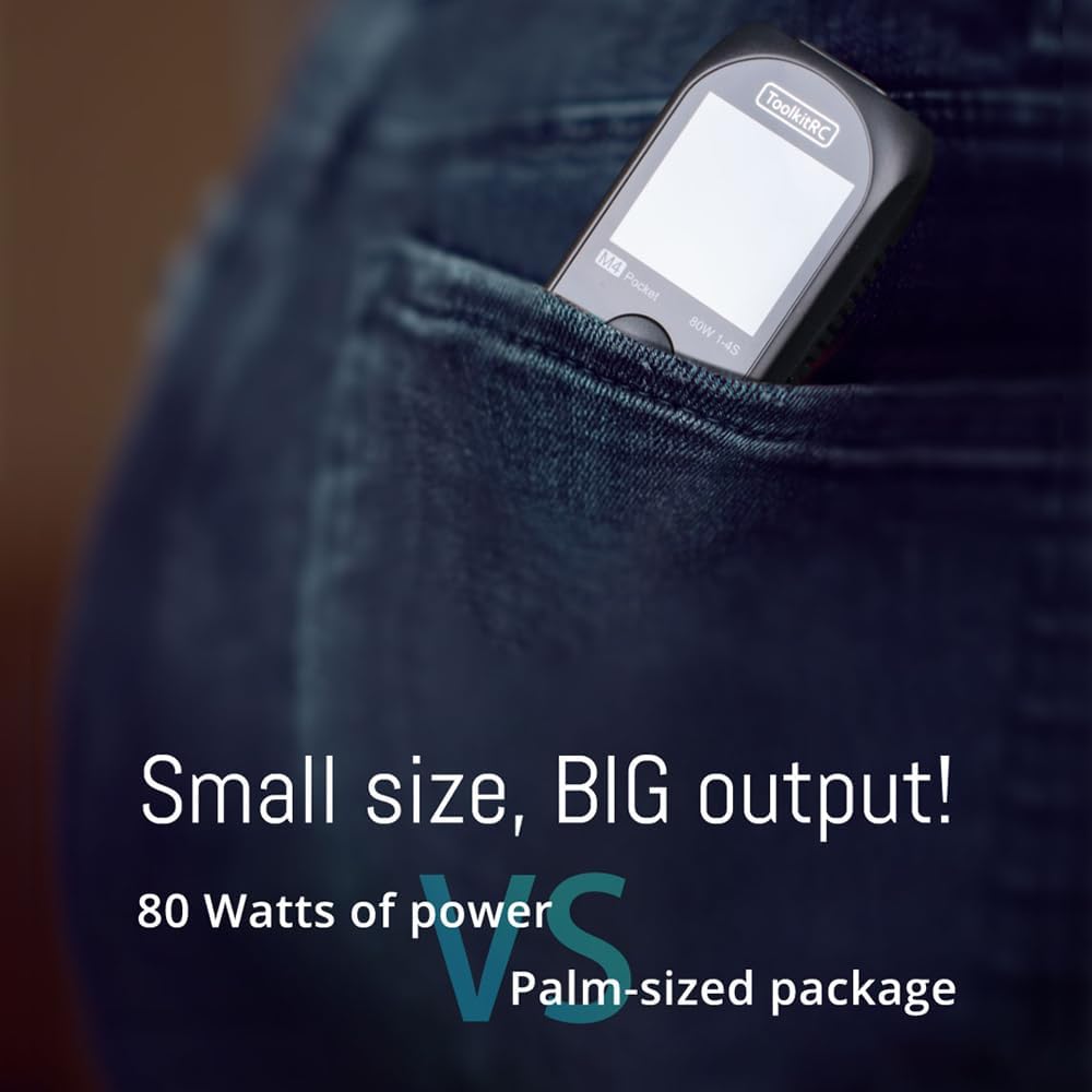 The ToolkitRC M4 Pocket is a 5A 80W mini lipo battery balanced charger that supports XT60 and TYPE-C inputs. XT30/XT60 output design for more convenient switching.