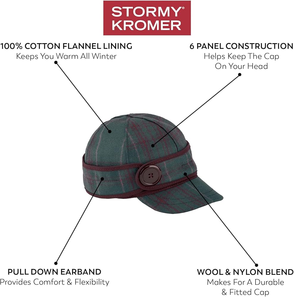 قبعة ذات أزرار: توفر قبعة Stormy Kromer ذات الأزرار الملاءمة والراحة لقبعة Kromer الأصلية، ولكن مع زر كبير الحجم مخيط لامع لإضافة القليل من الذوق الأنثوي. إنه يحتوي على نفس البناء المكون من ستة ألواح مصمم ليبقى على رأسك.