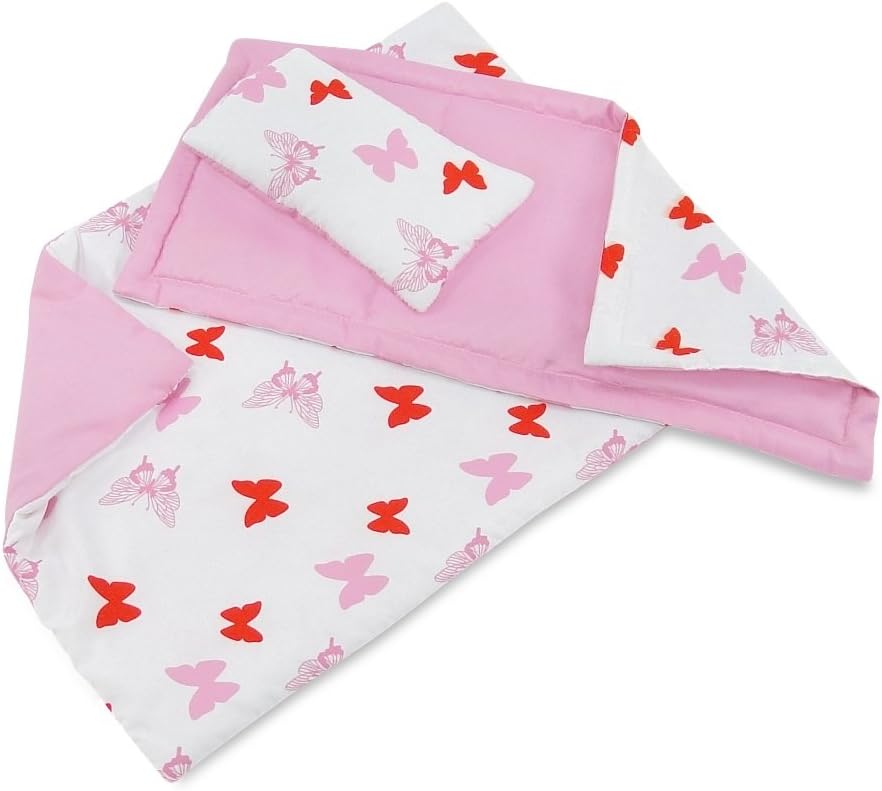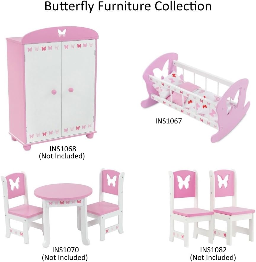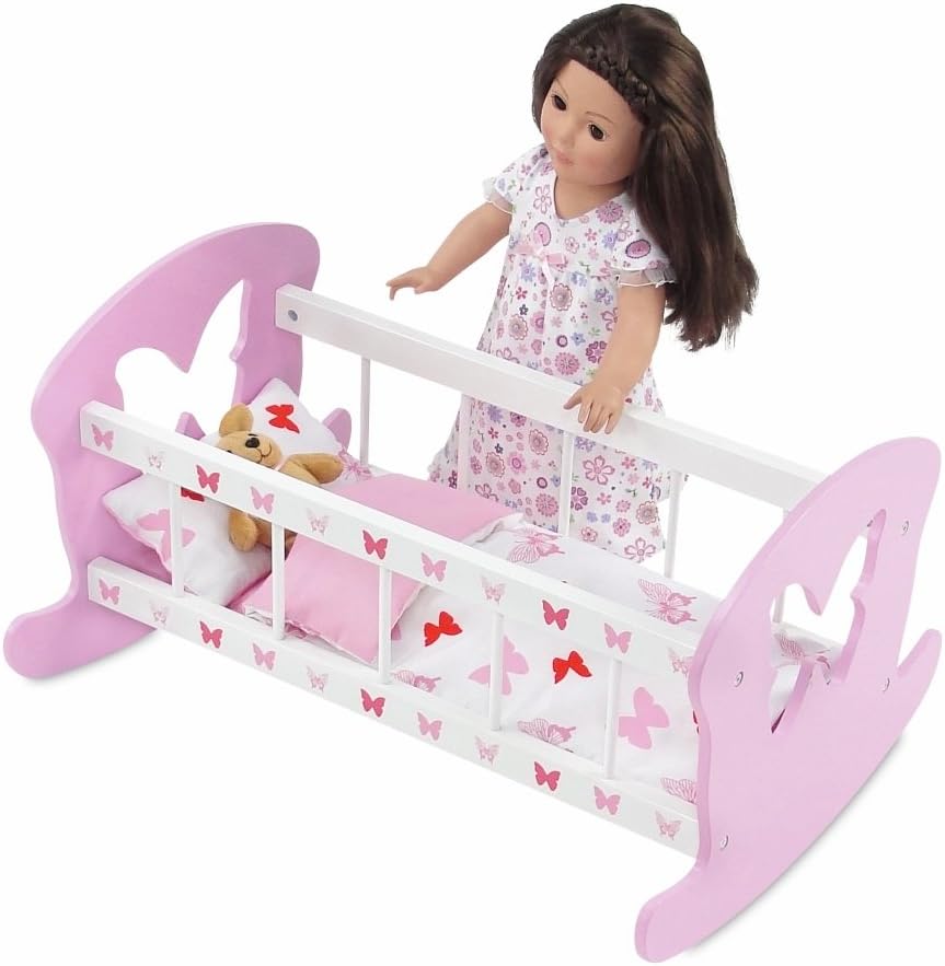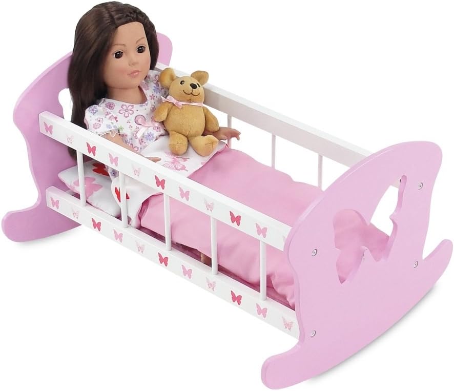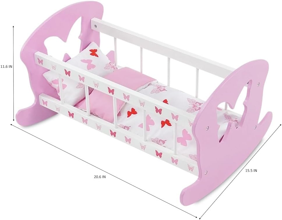 وصف الميزة: مهد دمية مقاس 18 بوصة، قوي ومتين، يتضمن فراش دمية بتصميم فراشة باللونين الوردي والأبيض، بما في ذلك اللحاف والمرتبة والوسادة!