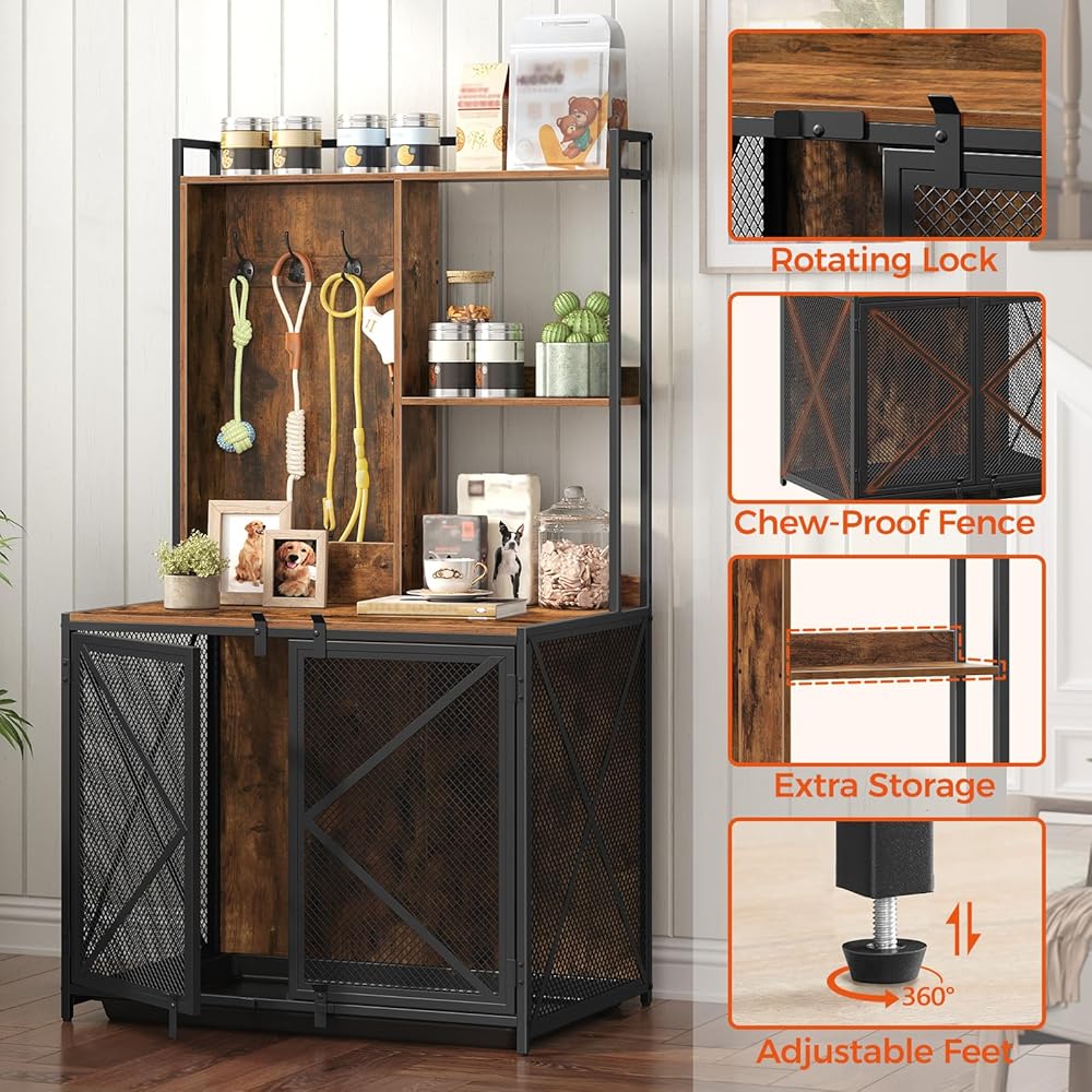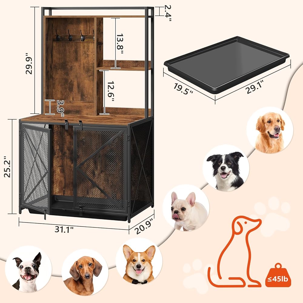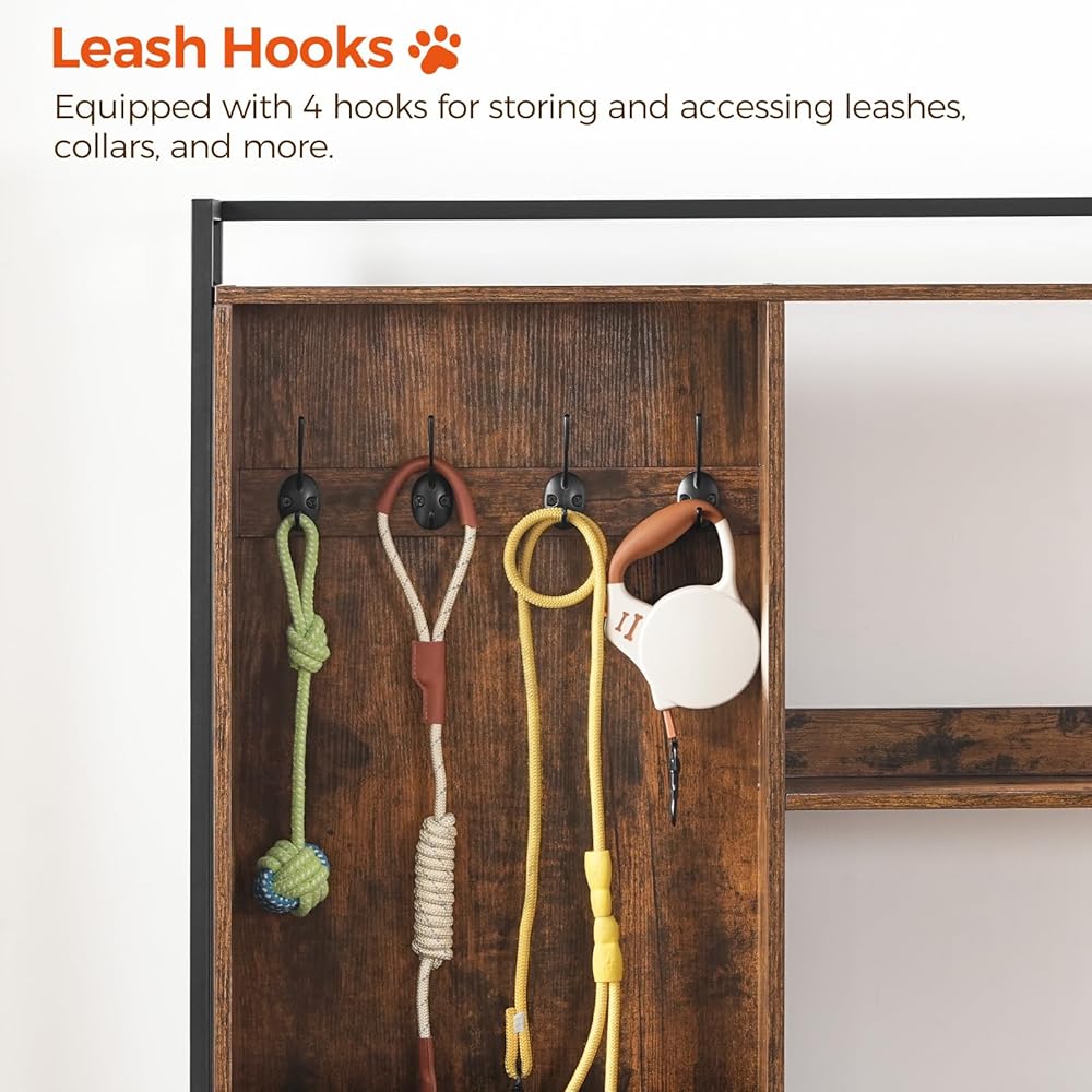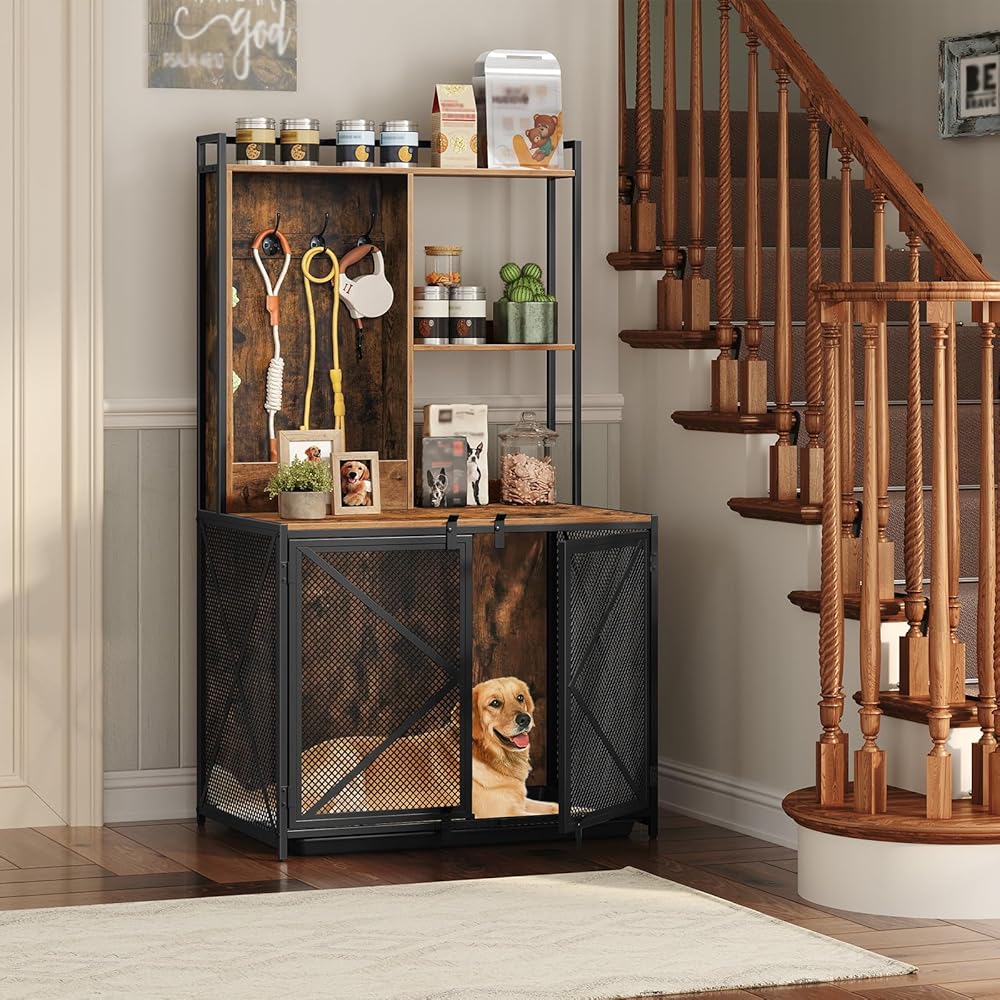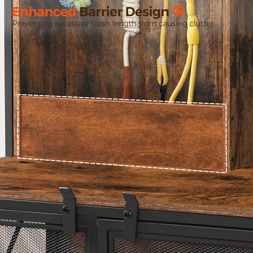 تصميم تخزين شامل: يوفر قفص الكلاب هذا المصمم على طراز الأثاث منصة علوية واسعة رائعة لطعام الكلاب، بالإضافة إلى رفين مفتوحين للديكور أو مستلزمات الحيوانات الأليفة الصغيرة. أربعة خطافات تتيح لك تعليق المقاود والألعاب والمفاتيح، مما يحافظ على المساحة الخاصة بك منظمة وبعيدًا عن الفوضى