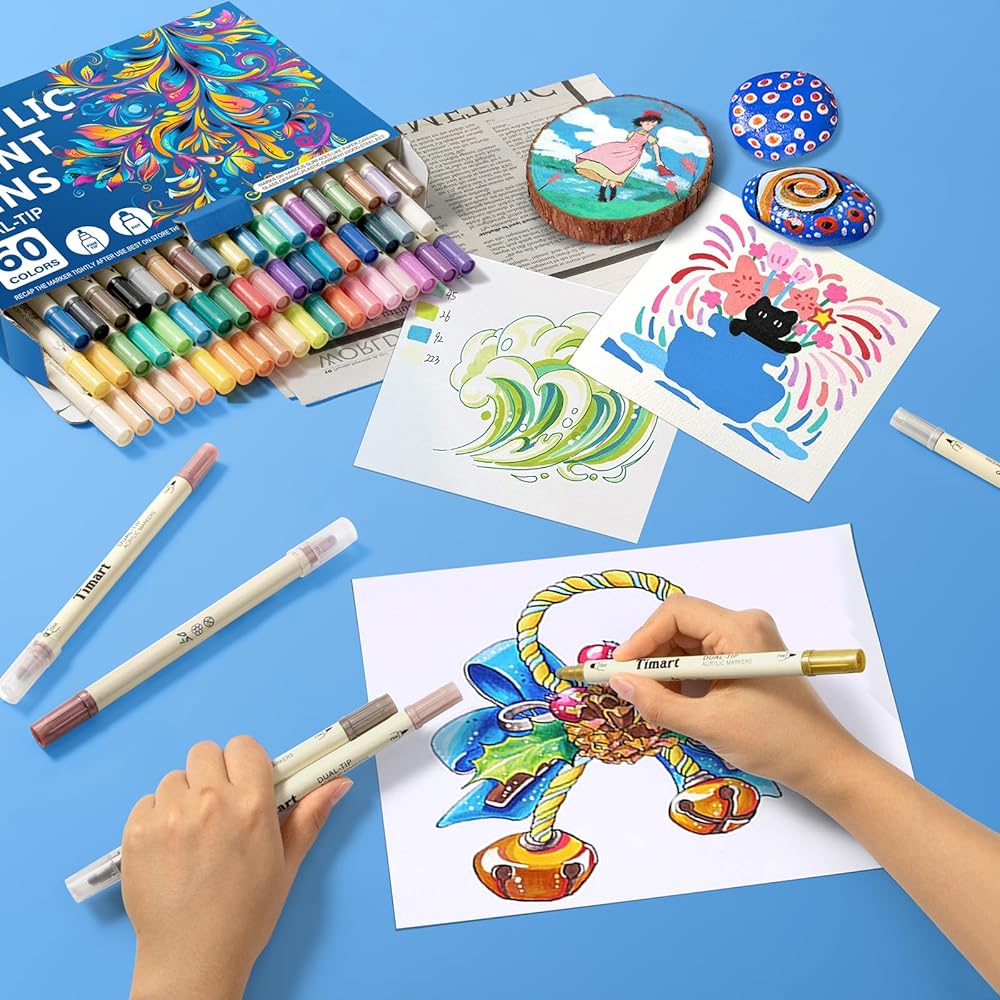 60 لونًا فريدًا وحيويًا: تتضمن مجموعة أقلام الطلاء الأكريليك Timart 60 45 لونًا قياسيًا حيويًا و15 لونًا معدنيًا مذهلاً. مع هذه المجموعة الواسعة من الألوان، سيكون لديك كل ما تحتاجه لمشروعاتك الإبداعية. مثالية للحرف اليدوية أو بطاقات المعايدة أو سجلات القصاصات أو الهدايا الشخصية. قم بالمزج والطبقة والمزج لإنشاء ظلال مخصصة وتأثيرات فريدة على أي سطح.