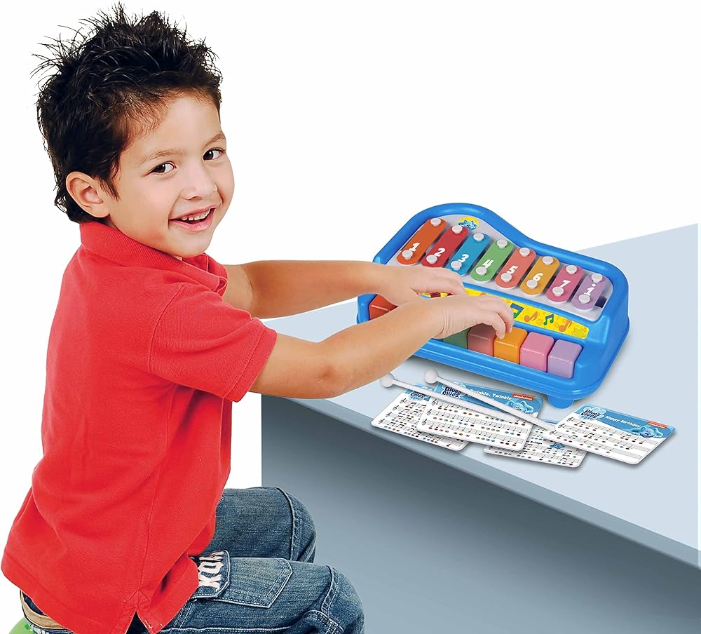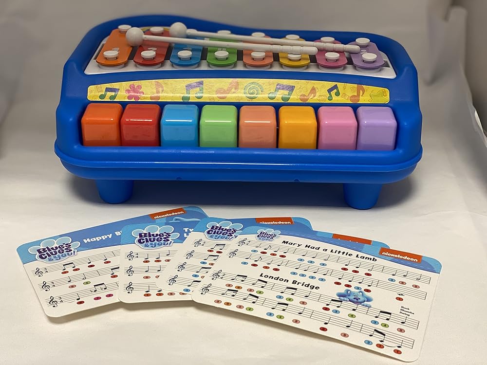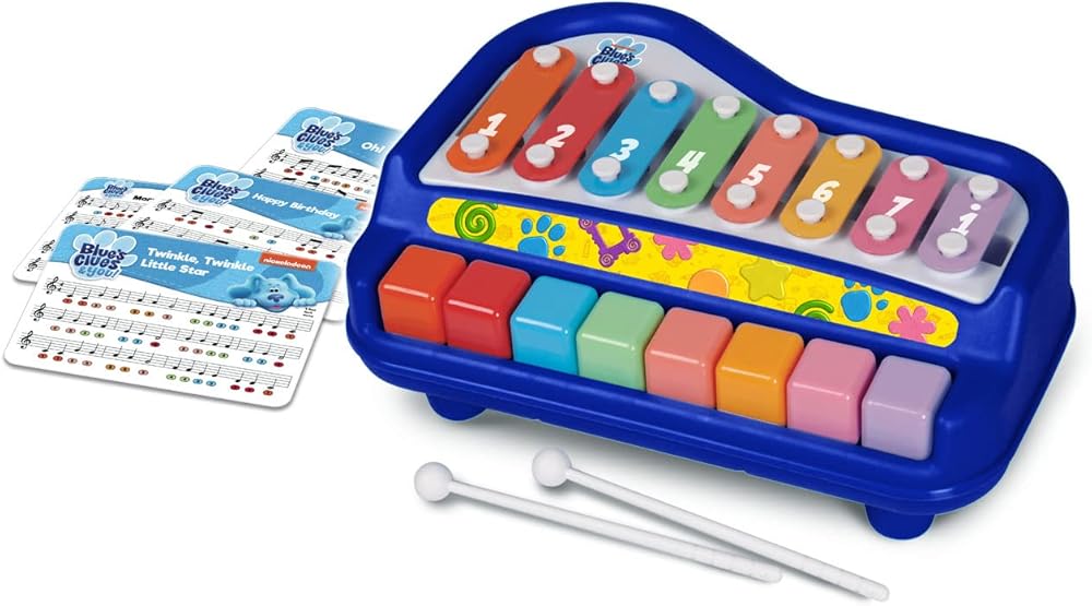 This colorful Blue's Clues & You 2-in-1 toddler piano and xylophone helps introduce kids to music and sounds. The xylophone and piano combination features an 8-key piano and an 8-note xylophone so your little musician can create their own music. Keys have bright colors and numbers will help your child learn colors, numbers, sounds, and musical notes in addition to enhancing hand-eye coordination. The Blue's Clues & You Play Along Baby Piano comes with plastic mallets that can be stored beneath the piano. This 2-in-1 toy also comes with 4 song cards so your child can learn to play songs like “Happy Birthday” and other well-known tunes. Custom Blue's Clues & You graphics on the kid piano make it especially inviting for aspiring musicians and fans. For ages 3+.