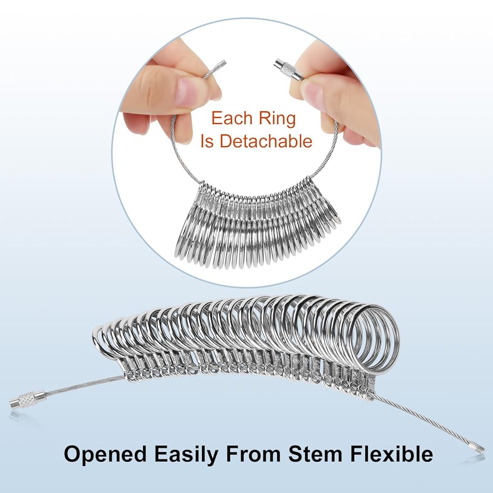 مجموعة أدوات قياس مقاس الخاتم: قطعة واحدة مكونة من 27 قطعة من أداة مقاس الخاتم المصنوعة من الفولاذ المقاوم للصدأ؛ قطعتان من أدوات حزام قياس الحلقات البلاستيكية وواحدة منهما مزودة بعدسة مكبرة.