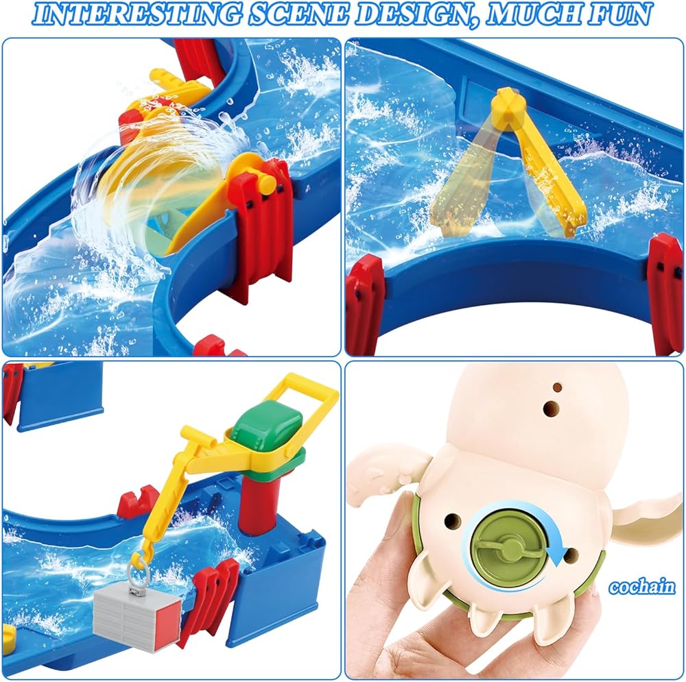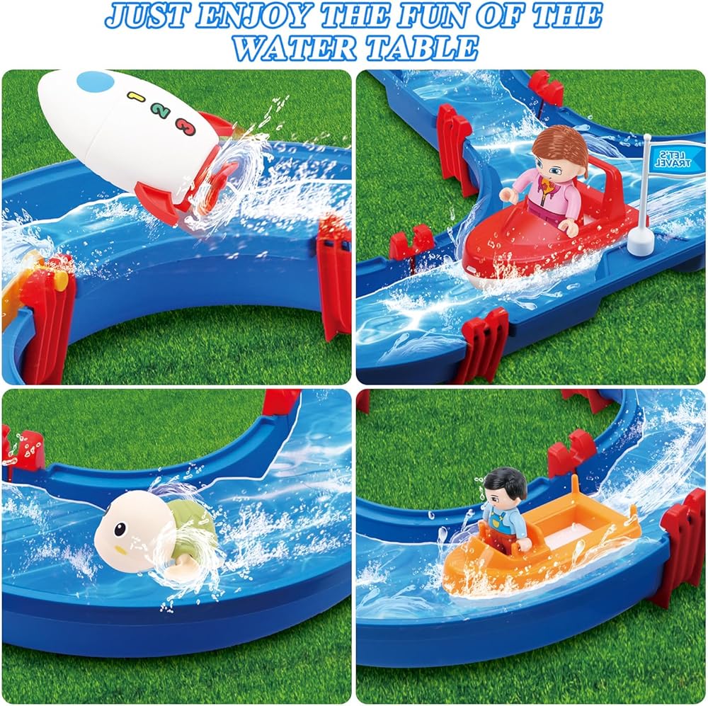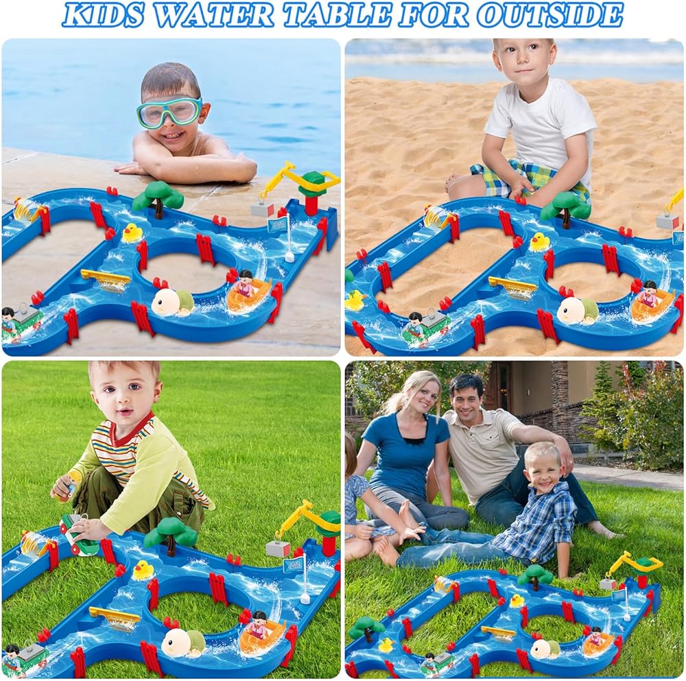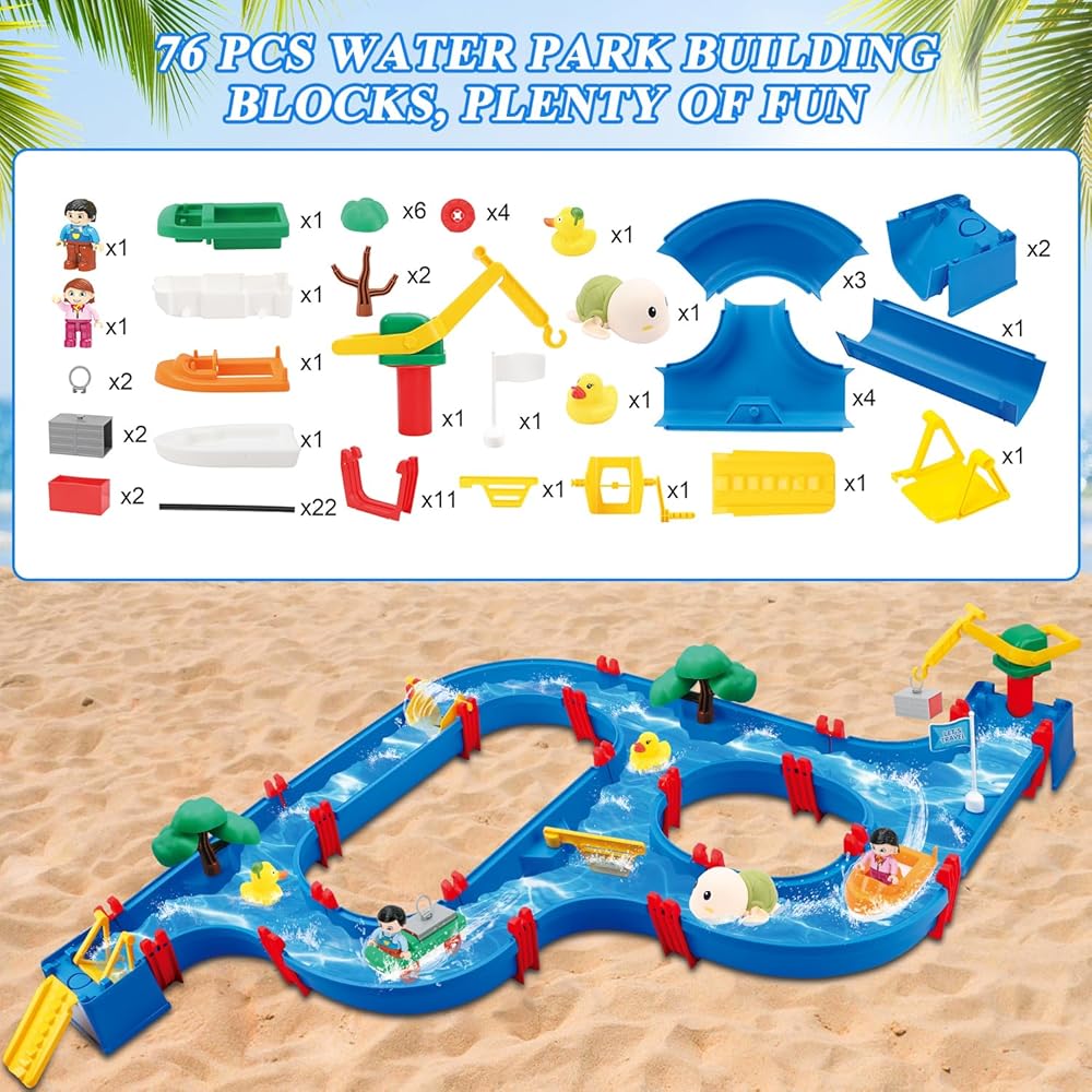 ألعاب طاولة المياه الخارجية للأطفال من موستوب، 76 قطعة من مجموعة لعب الحديقة المائية الكبيرة للأطفال، لعبة طاولة المياه الخارجية مع قارب، ألعاب الممرات المائية بالخارج للأطفال الصغار الأولاد في الصيف في الهواء الطلق على الشاطئ