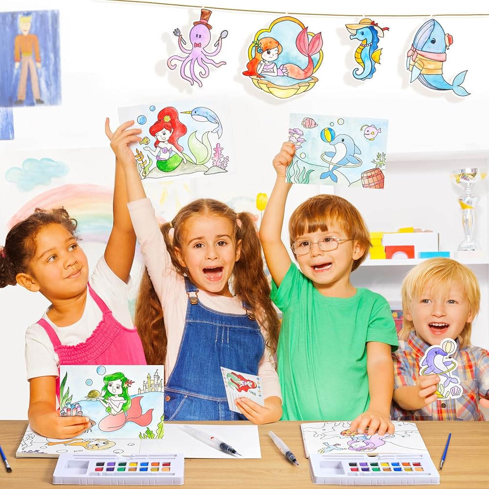 متعة الرسم والحرف مجتمعة: مجموعة الألوان المائية لدينا توفر أكثر من مجرد رسم. بمجرد اكتمال أعمالهم الفنية، يمكن للأطفال بسهولة إزالة أعمالهم الفنية من الورق لإنشاء إشارات مرجعية وديكورات وحتى بطاقات بريدية جميلة لمشاركة إبداعاتهم ورغباتهم. يحتوي كتاب الألوان المائية على 20 صفحة مختلفة تحت الماء، بما في ذلك 15 صفحة بألوان مائية، وبطاقتين بريديتين، وعلامتين مرجعيتين، و4 زخارف معلقة. تشجع هذه المجموعة الأطفال على الانغماس في فن الألوان المائية، بعيدًا عن الشاشات والإلكترونيات