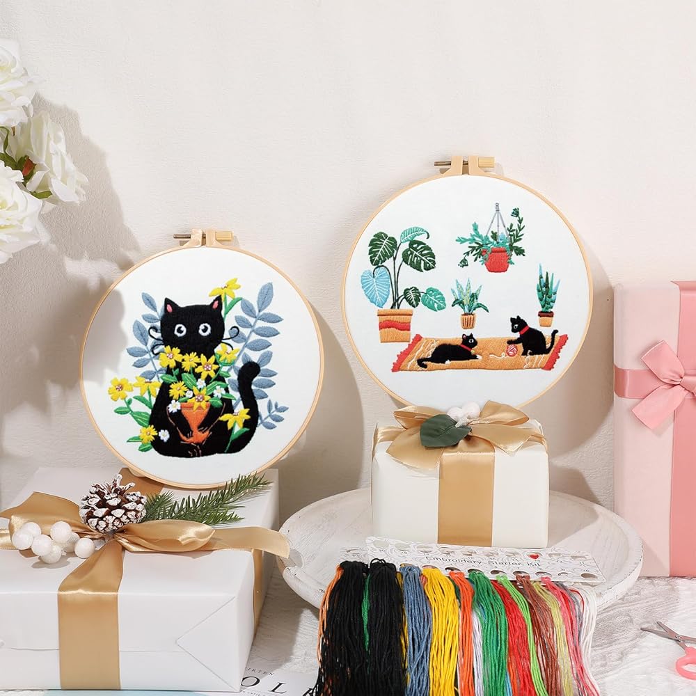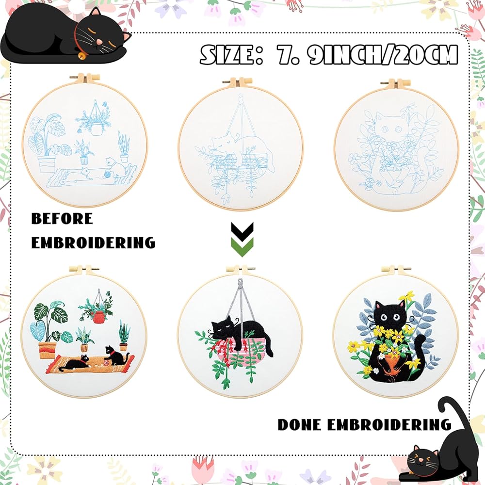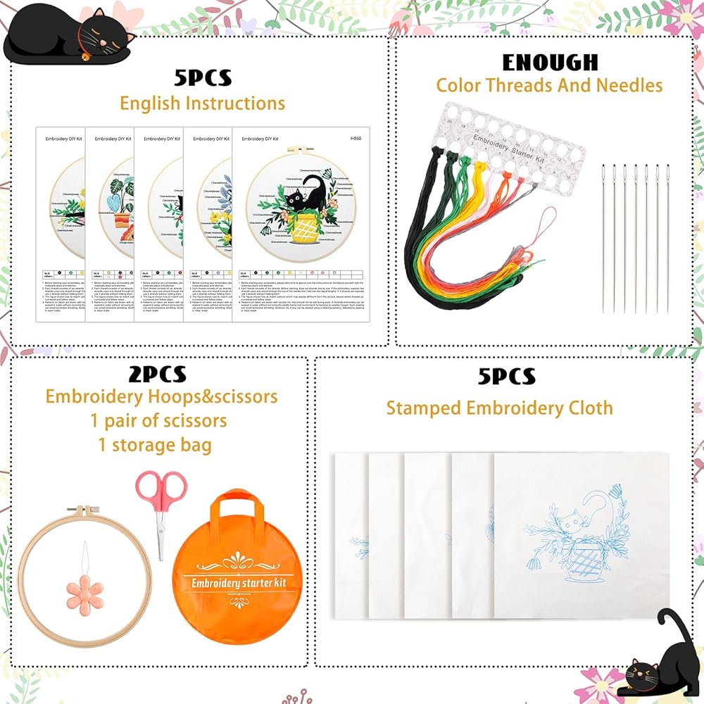 5 مجموعات من أدوات التطريز للمبتدئين مع أنماط وتعليمات القطة السوداء، مجموعات التطريز بالغرز المتقاطعة للمبتدئين، بما في ذلك حلقتين تطريز بلاستيكيتين، ومقص واحد، وإبر خيوط ملونة