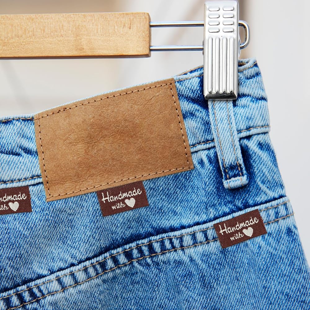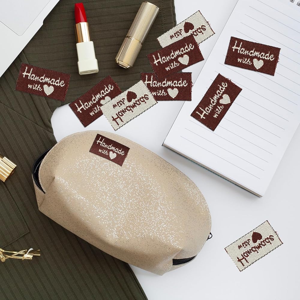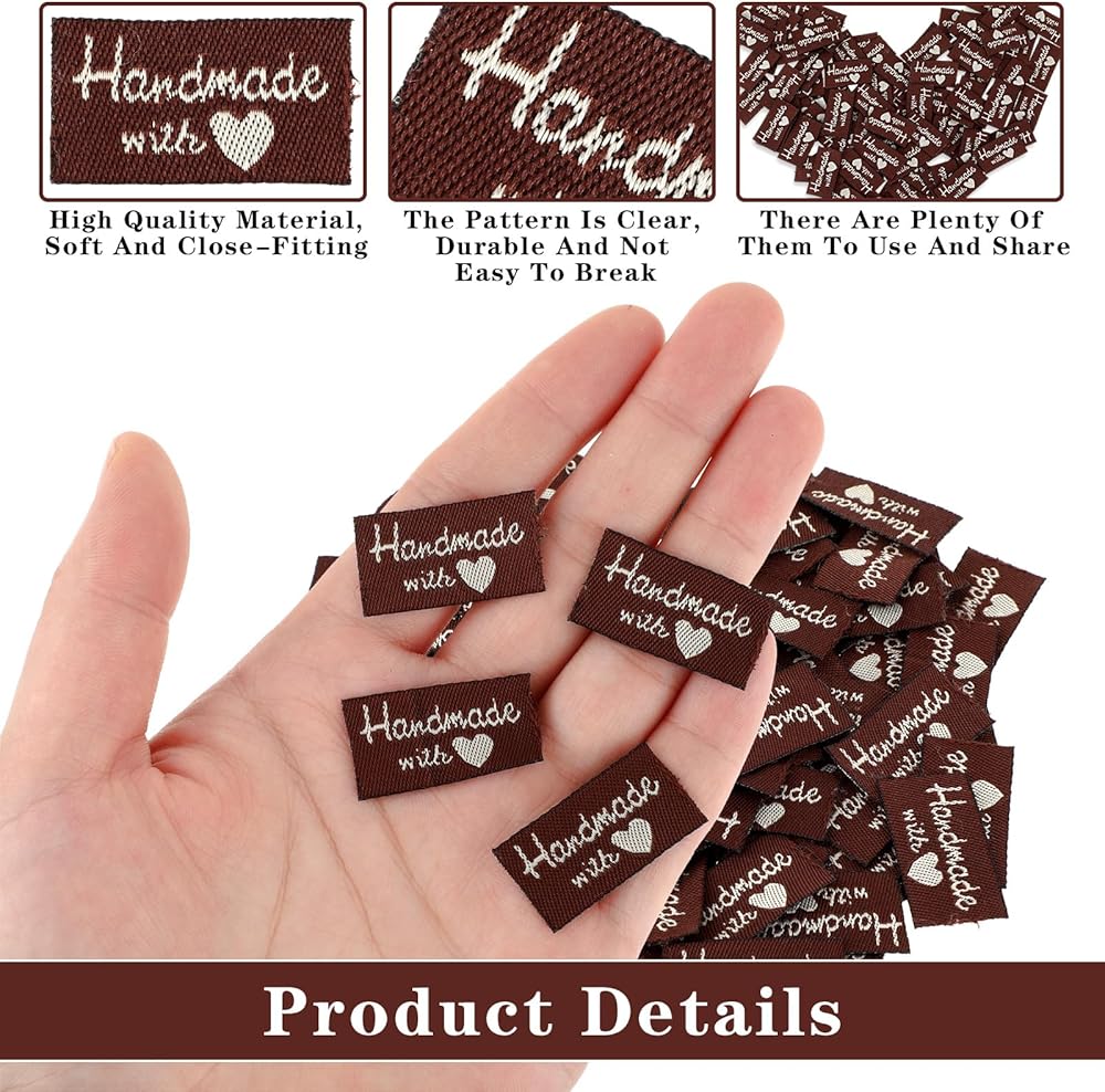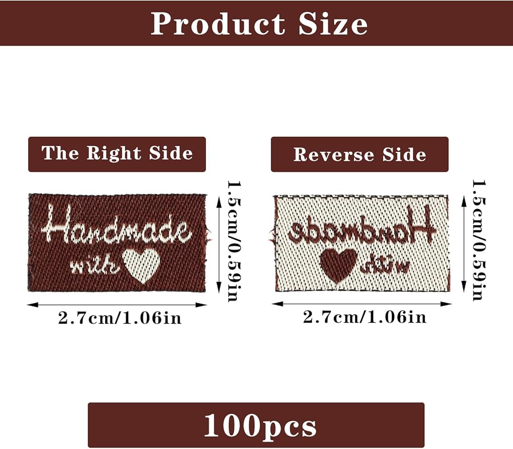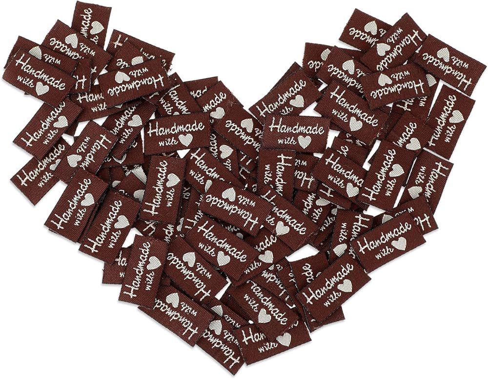 Jeffdad 100 قطعة من ملصقات الخياطة للمنتجات المصنوعة يدويًا، مصنوعة يدويًا بملصقات الحب وعلامات منقوشة على الملابس، ملصقات قماشية للحرف اليدوية والحياكة والخياطة الكروشيه (بني عميق)
