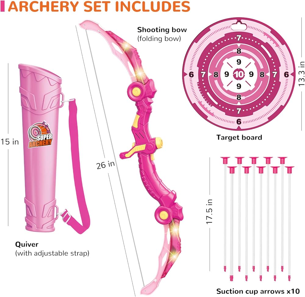 ألعاب القوس والسهم مع إضاءة LED للرماية، هدية عيد ميلاد للفتيات 5 6 7 8 9 10 11 12 سنة، لعبة نشاط داخلي وخارجي لعيد الميلاد للأطفال الفتيات من سن 6 إلى 8 سنوات، 10 سهام كأس شفط، هدف، جعبة