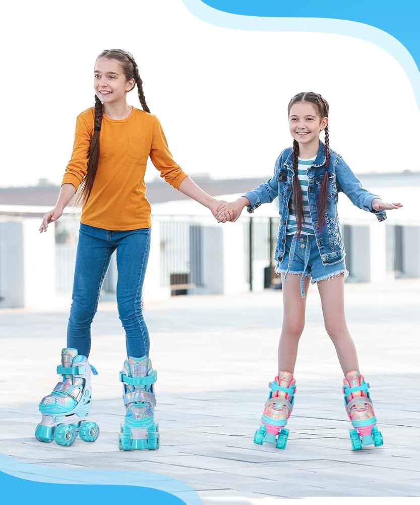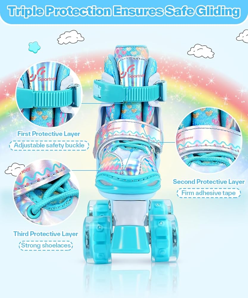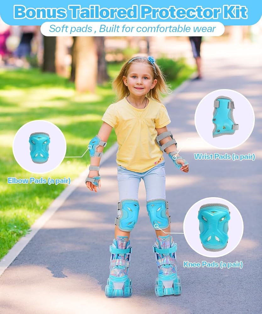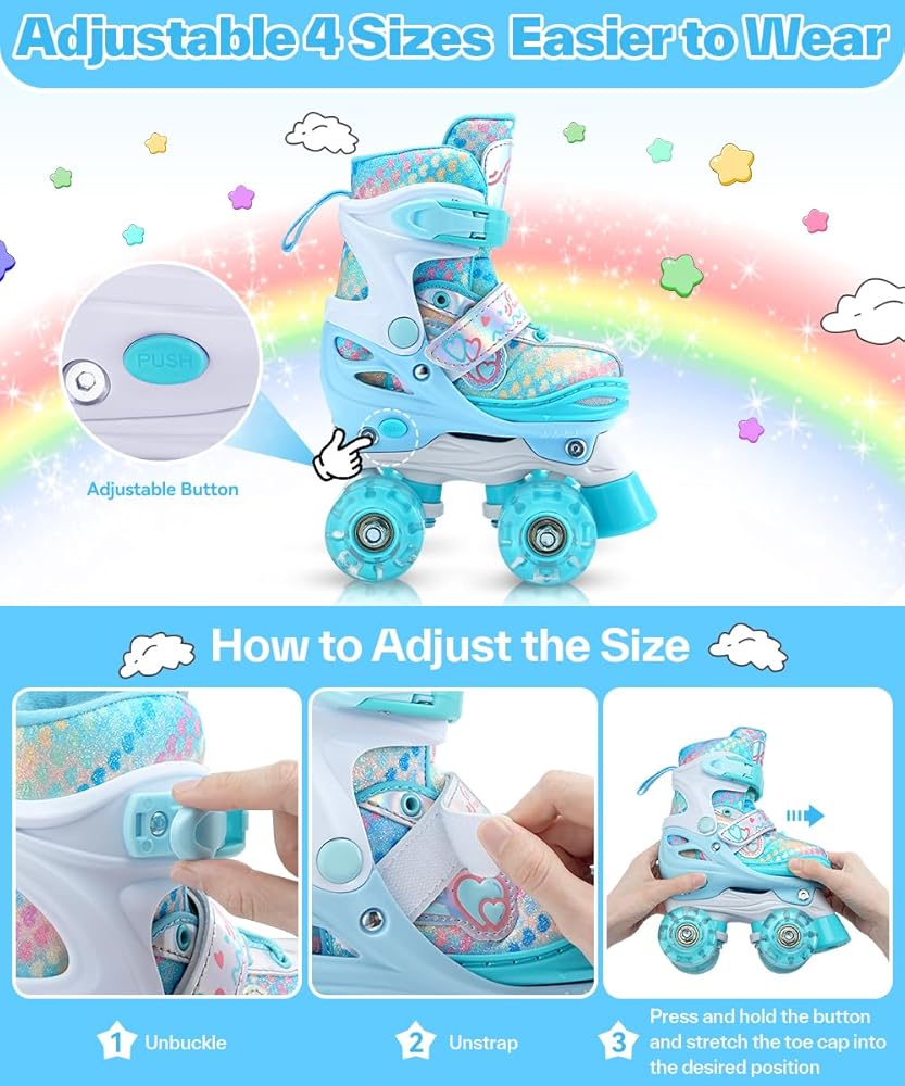زلاجات دوارة قابلة للتعديل بـ 4 مقاسات للفتيات: يمكن لهذه الزلاجات الدوارة للفتيات أن تنمو مع طفلك، بفضل مقاساتها الأربعة القابلة للتعديل. يمكن للأطفال تعديلها بأنفسهم بسهولة عن طريق الضغط على زر، وتحتاج فقط إلى الاختيار وفقًا لحجم الصورة زوجًا من أحذية التزلج المناسبة للفتيات. اختر من بين XS(9.5C-11.5C)، S(12C-1.5Y) أو M(2Y-5Y) لضمان الملاءمة المثالية لطفلك الصغير، ويمكن تعديله بسهولة لاستيعاب نمو القدم المتنامي. لا تقلق بشأن الاضطرار إلى تغيير أحذية التزلج الخاصة بك كثيرًا.