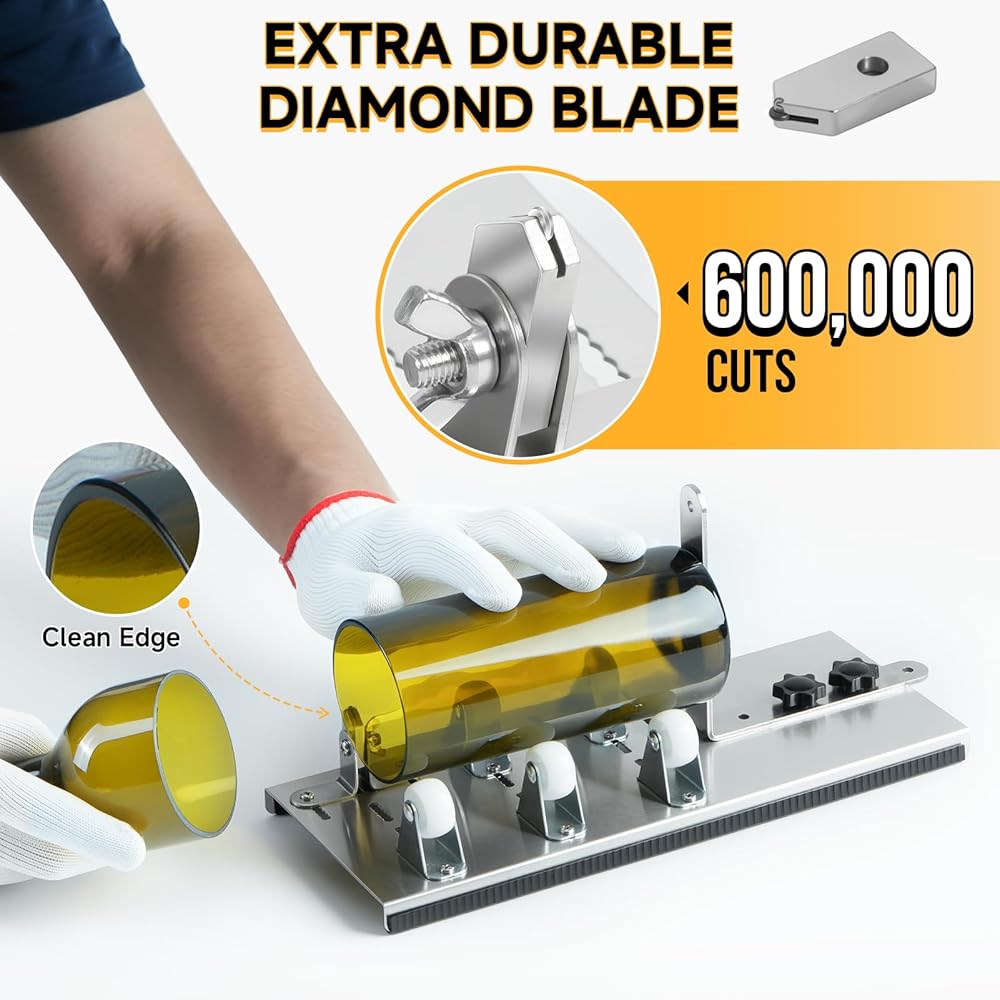 【ترقية قاطعة الزجاجات】- يتضمن تصميم قاطعة الزجاجات 5 عجلات دعم تم إنشاؤها خصيصًا لتثبيت الزجاجة بشكل أفضل، من أجل قطع أكثر دقة. بالإضافة إلى ذلك، تمت ترقية اللوحة السفلية لقاطع الزجاجات إلى مادة الفولاذ المقاوم للصدأ وقمنا بترقية جميع الملحقات لتكون قابلة للتعديل وأضفنا شفرة احتياطية، والتي يمكنها القطع أكثر من 400000 مرة، مما يمكن أن يطيل عمر خدمة هذا المنتج.