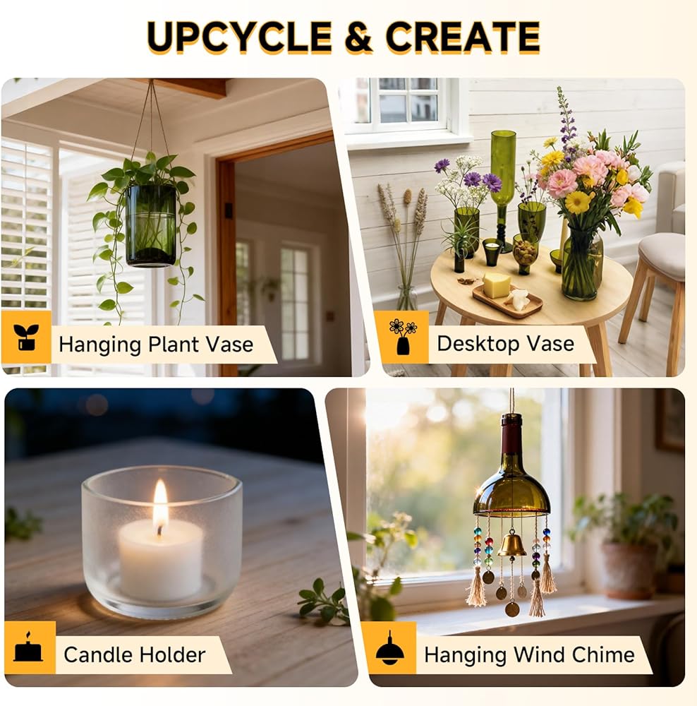 【الإبداع وحماية البيئة بنفسك】- باستخدام قطاعة الزجاجات يمكنك إنشاء ديكورات إبداعية بسهولة، مثل المزهريات وحوامل الشموع وعاكس الضوء العطري وما إلى ذلك. وهذا سيعزز تفكيرك الإبداعي وإحساسك الفني. أثناء تزيين حياتك الفريدة والجميلة، في نفس الوقت تجنب تلوث البيئة بواسطة الزجاجات المقاومة للحرارة. شكرا لمساهمتك في البيئة