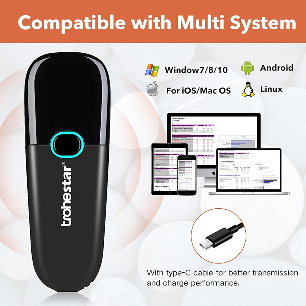 دعم الأنظمة وأنواع الباركود: ماسح الباركود متوافق مع أنظمة التشغيل Windows وLinux وAndroid وIOS وMac OS. فك رموز الباركود القياسية 1D المختلفة، مثل UPC وEAN وISSN وGS1 وغيرها من الرموز الشريطية القياسية.