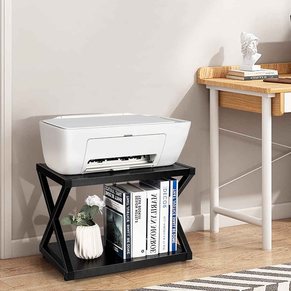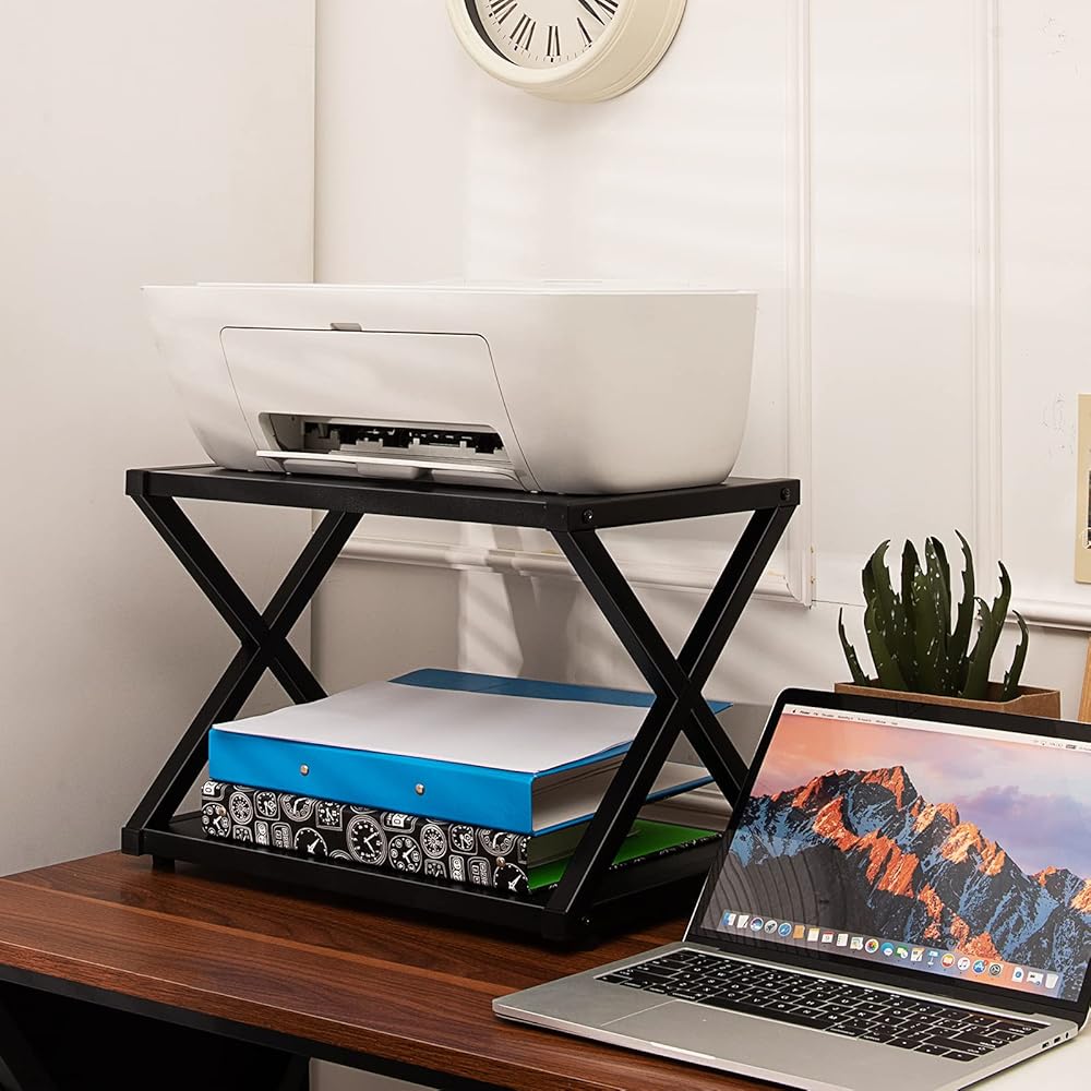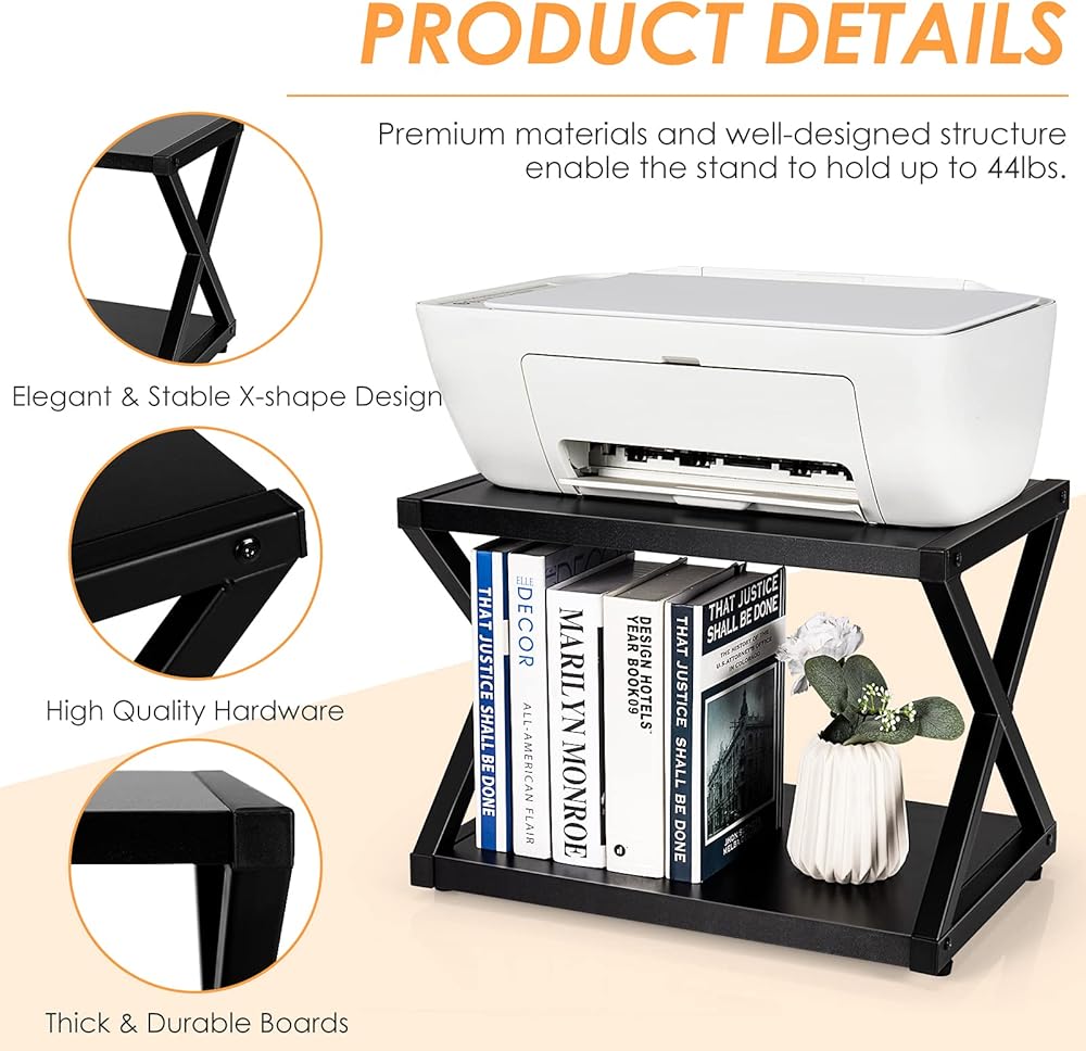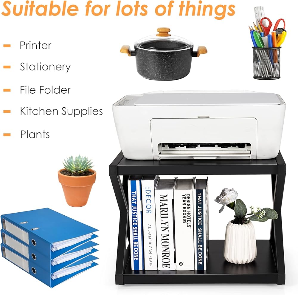 This 2-tier printer stand is built with a strong bearing capacity up to 33lbs for each layer. The compact desktop organizer can be used as a printer stand, book shelf, plant pot tray and kitchen rack to provide extra storage place. The unique X-shaped iron frame and thickened wood board improves the sturdiness and durability of the stand. Made of high quality engineered wood, the desktop organizer is waterproof and anti-scratch to ensure a long service life. The daily maintenance is easy for everyone: just simply wipe the surface with a clean cloth. Our modern style printer shelf is able to match various room decors like office, bedroom, study, kitchen and living room. Get one compact desktop printer stand to make your life simple.
