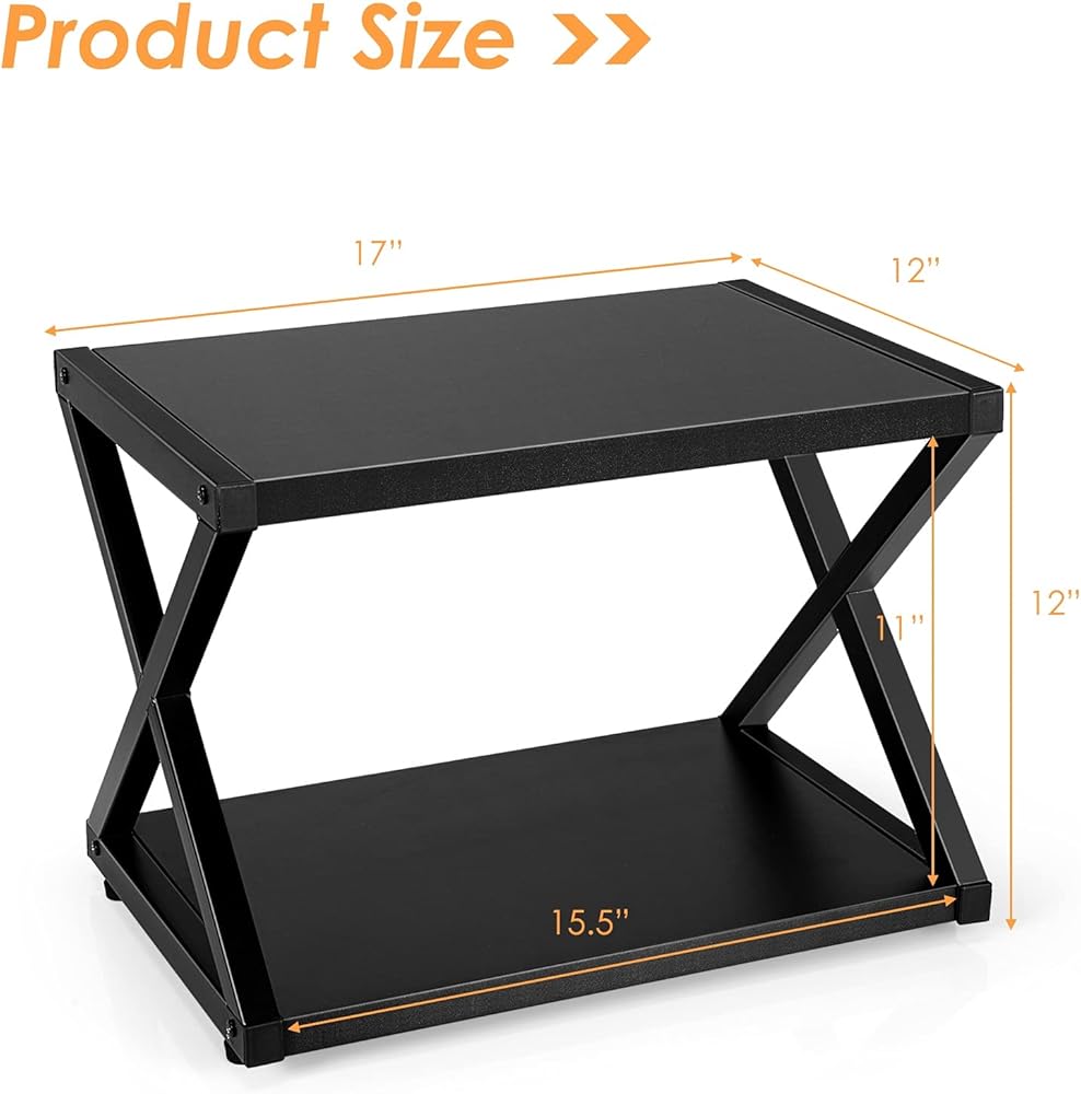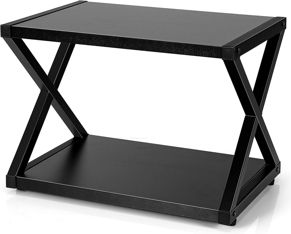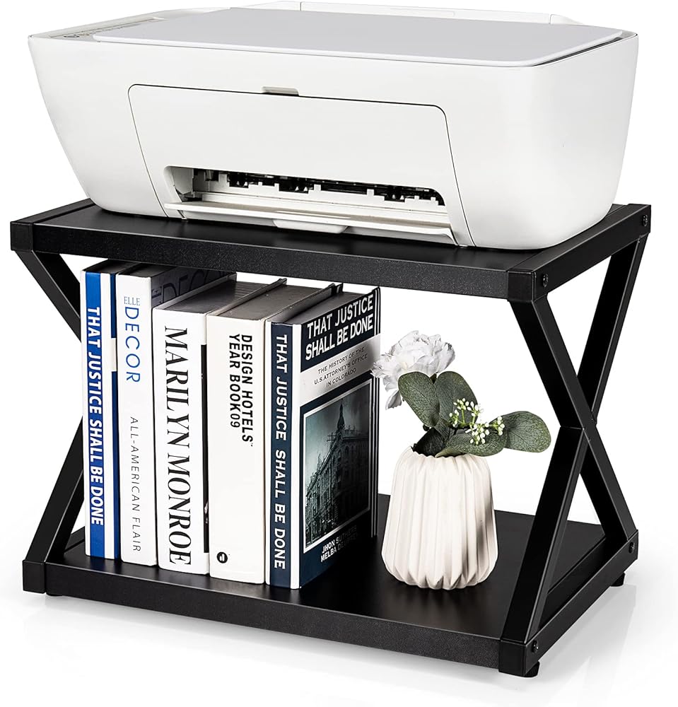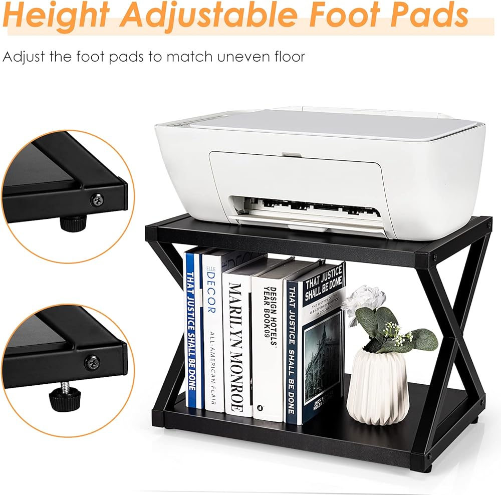 This 2-tier printer stand is built with a strong bearing capacity up to 33lbs for each layer. The compact desktop organizer can be used as a printer stand, book shelf, plant pot tray and kitchen rack to provide extra storage place. The unique X-shaped iron frame and thickened wood board improves the sturdiness and durability of the stand. Made of high quality engineered wood, the desktop organizer is waterproof and anti-scratch to ensure a long service life. The daily maintenance is easy for everyone: just simply wipe the surface with a clean cloth. Our modern style printer shelf is able to match various room decors like office, bedroom, study, kitchen and living room. Get one compact desktop printer stand to make your life simple.