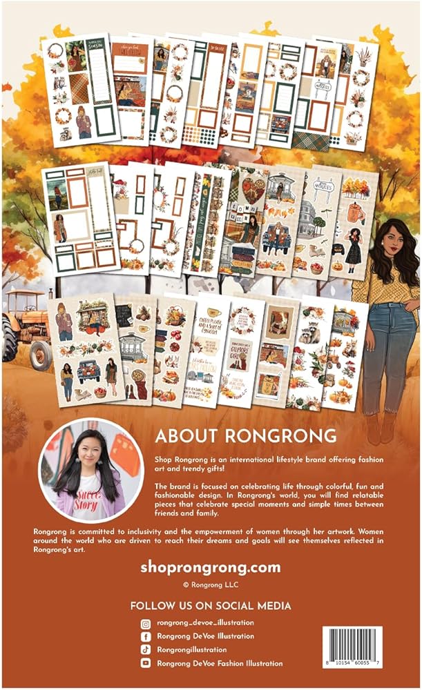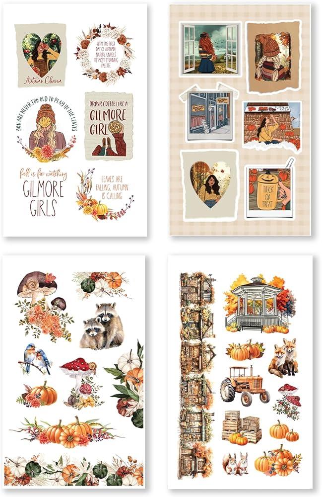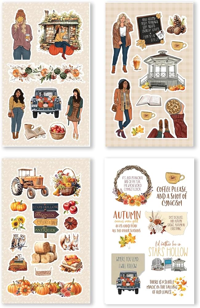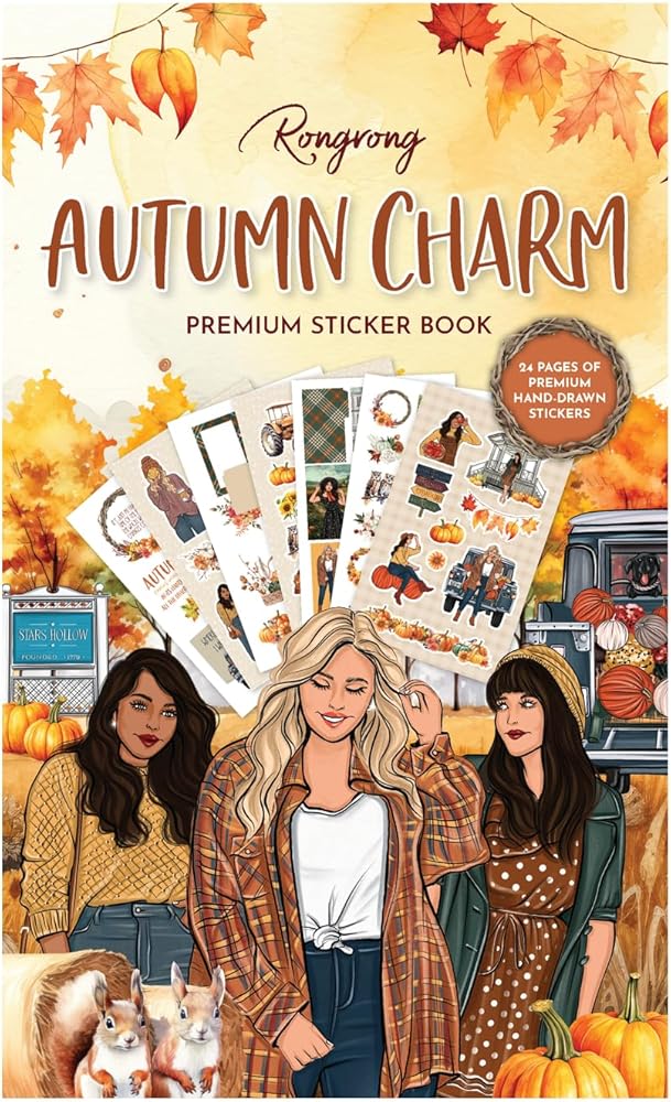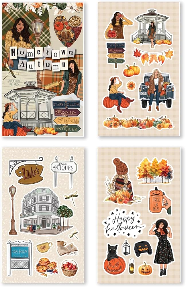 رسوم توضيحية مستوحاة من جيلمور جيرلز: يحتوي كتاب الملصقات هذا على رسوم توضيحية خاصة مستوحاة من فتيات جيلمور المحبوبات، مما يضيف لمسة حنين إلى مشاريعك ذات الطابع الخريفي. تمتلئ كل صفحة بالألوان الدافئة والأوراق المتساقطة والعناصر الغريبة التي تستحضر سحر الموسم.