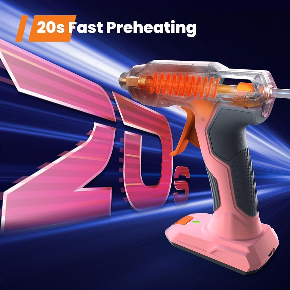 • 20s Fast Preheating & Cordless Design - Preheating Faster! Only 20s heating time to work! 5 times faster than ordinary glue gun, greatly shorten your waiting time. Work Anywhere! No extension cords getting tangled up, limiting range of use, and works wherever you need it, long distance crafting, high place, even the outdoor working, it will be your great partner.