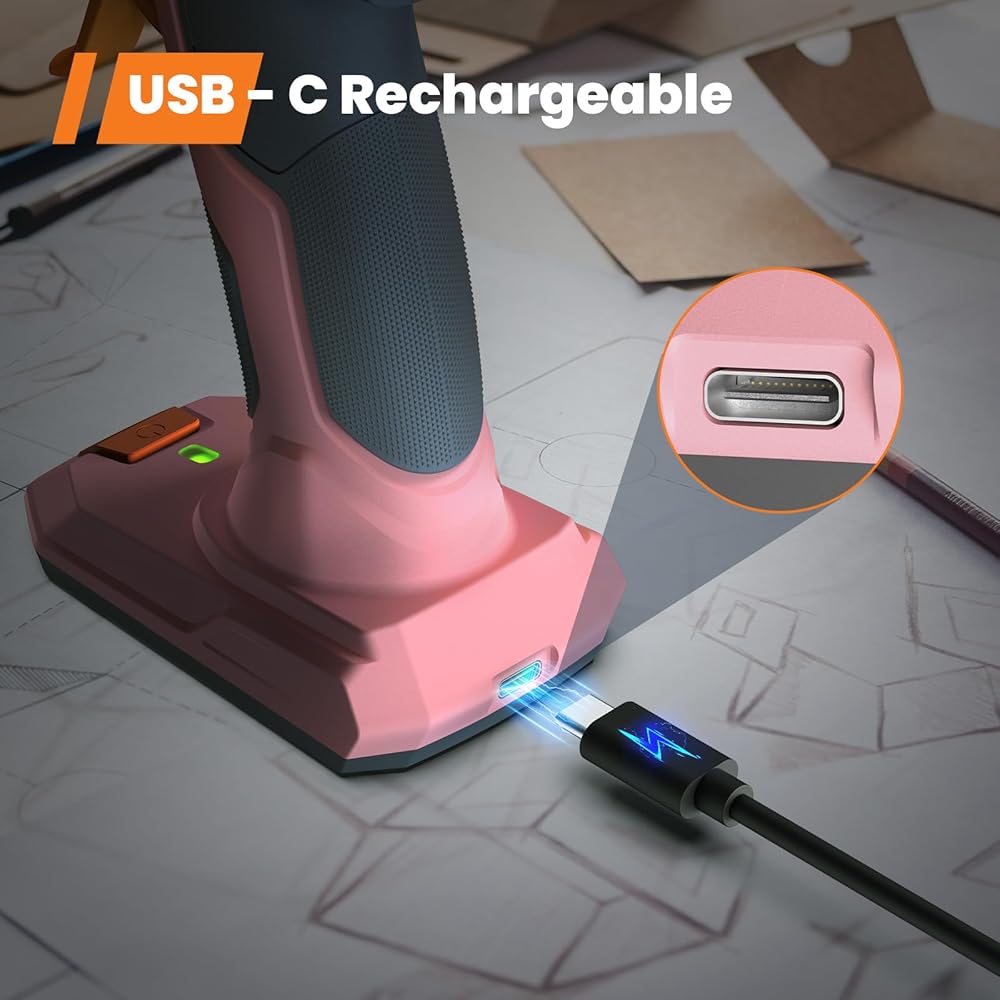 • USB-C Rechargeable & Ergonomic - Charging Anywhere! This cordless hot glue gun adopts a USB-C port, compatible with your electronic products USB-C cable, such as the laptop/PC, phone, more convenient for you. Suitable with 5V 2A charger. The ergonomic handle let your crafting more comfortable. Please Charge with the USB-C Cabel Contained In the Glue Gun Kit.