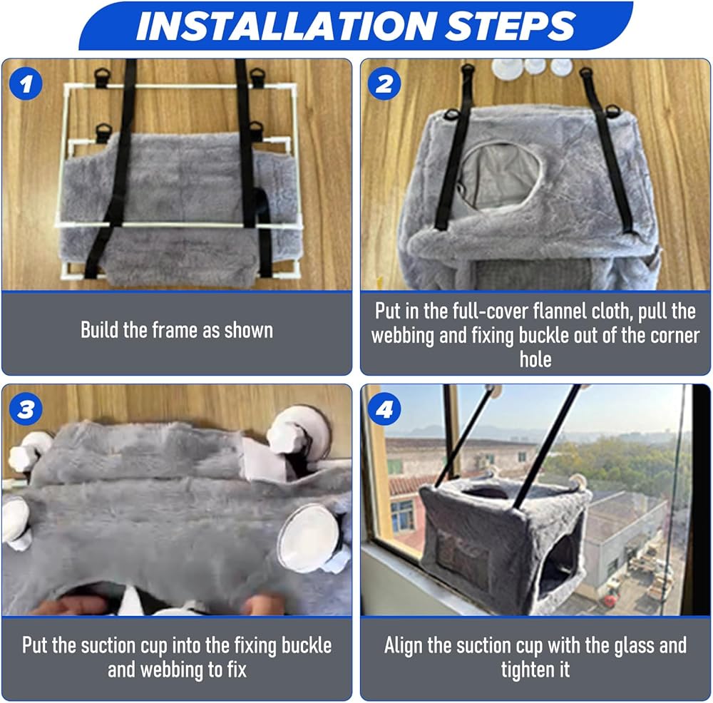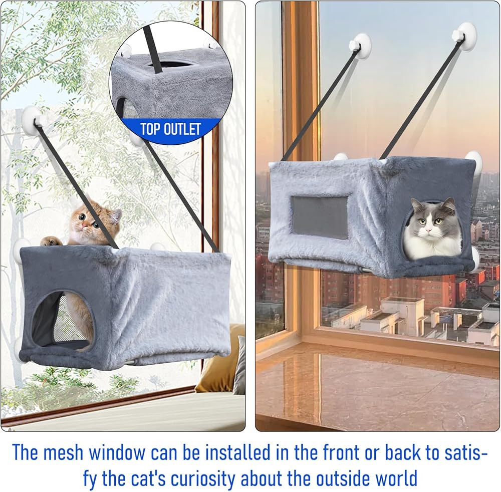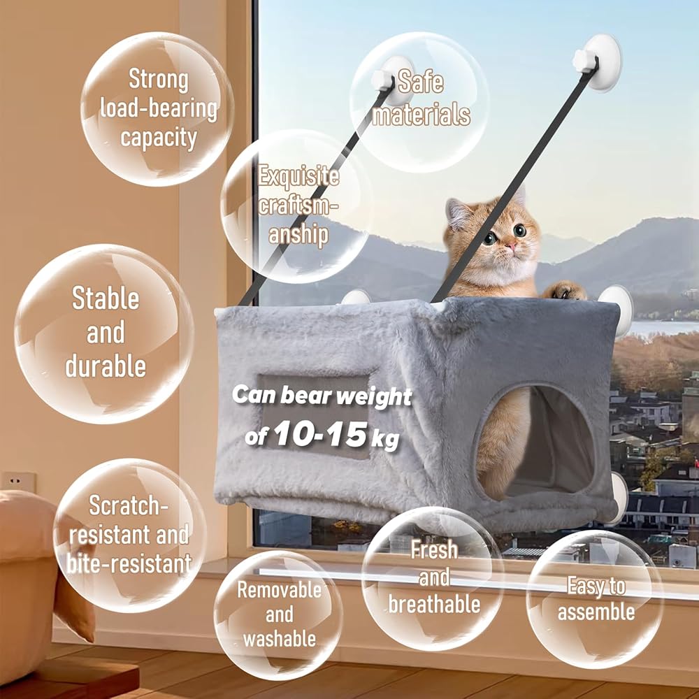 【Stable Attachment】Utilize stable screw suction cups to secure the cat bed on windows. The strong suction cups firmly hold the bed, ensuring stability. The package includes large and small suction cups capable of supporting up to 33 lbs