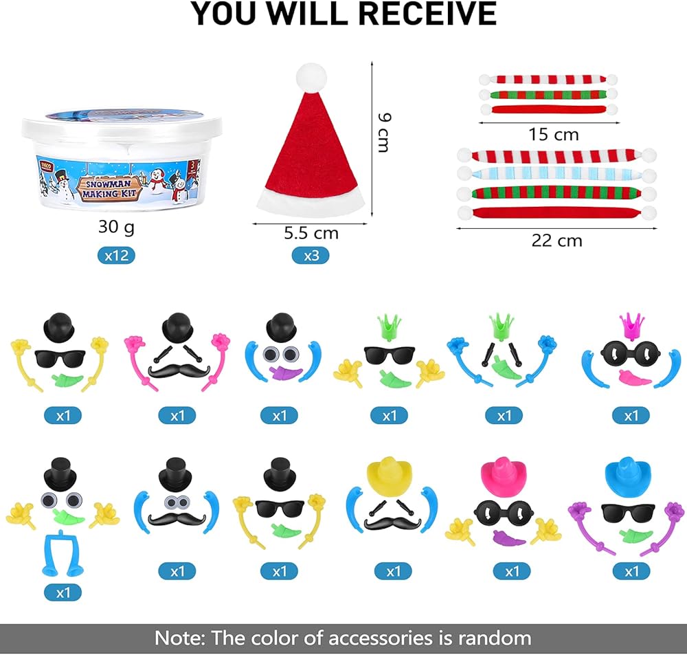 إكسسوارات غنية: إلى جانب 12 صندوقًا من الطين، سوف تحصل أيضًا على 7 قطع من الأوشحة و3 قبعات سانتا صغيرة، يمكنك فقط استخدام هذه الملحقات أو العديد من الديكورات الأخرى لتزيين رجل الثلج كما تريد، والاستمتاع مع العائلة مما يجعل رجل الثلج جميلًا. وفريدة من نوعها