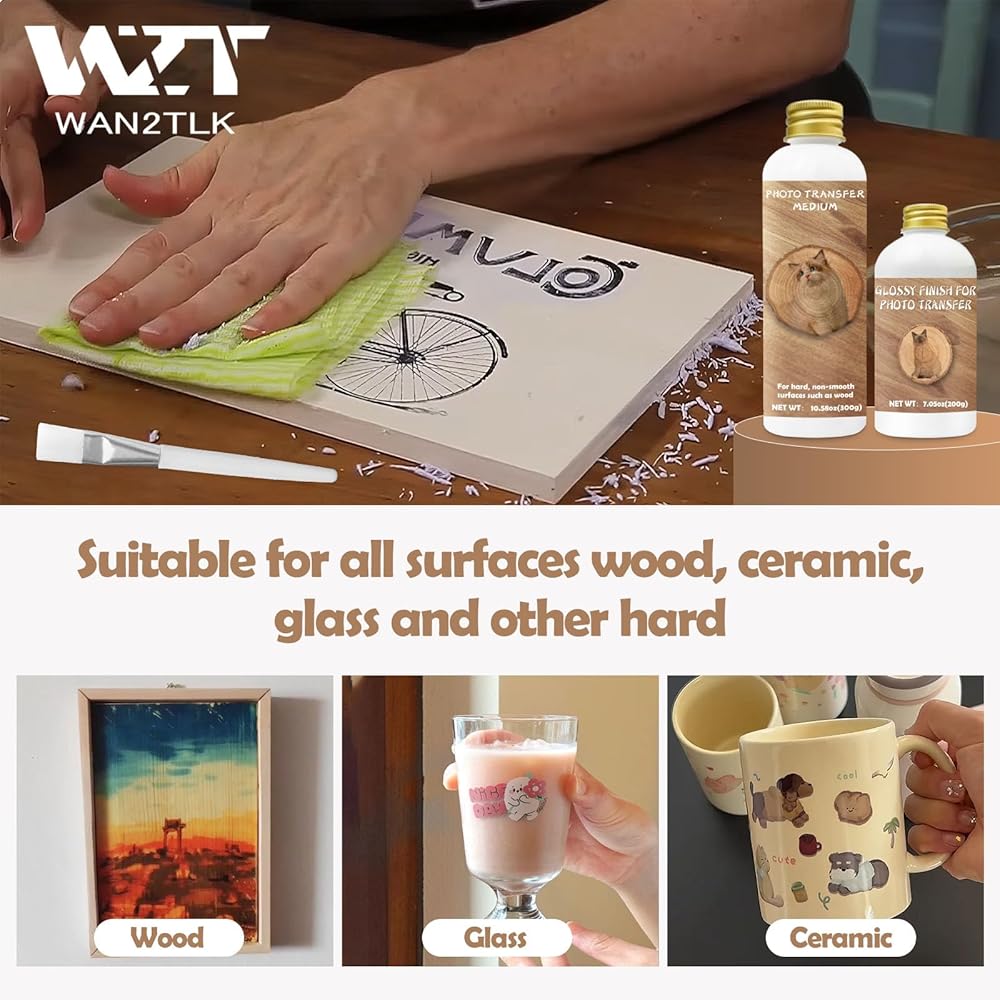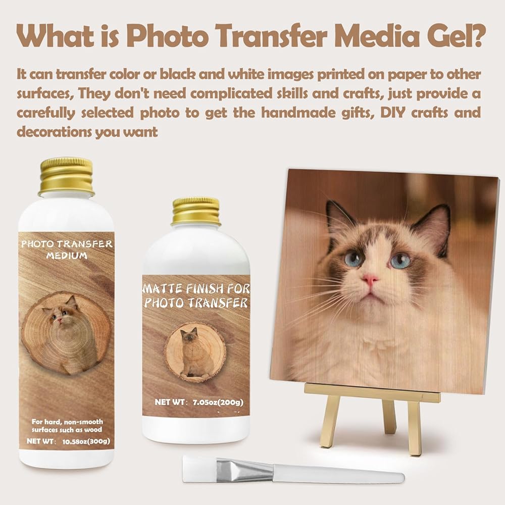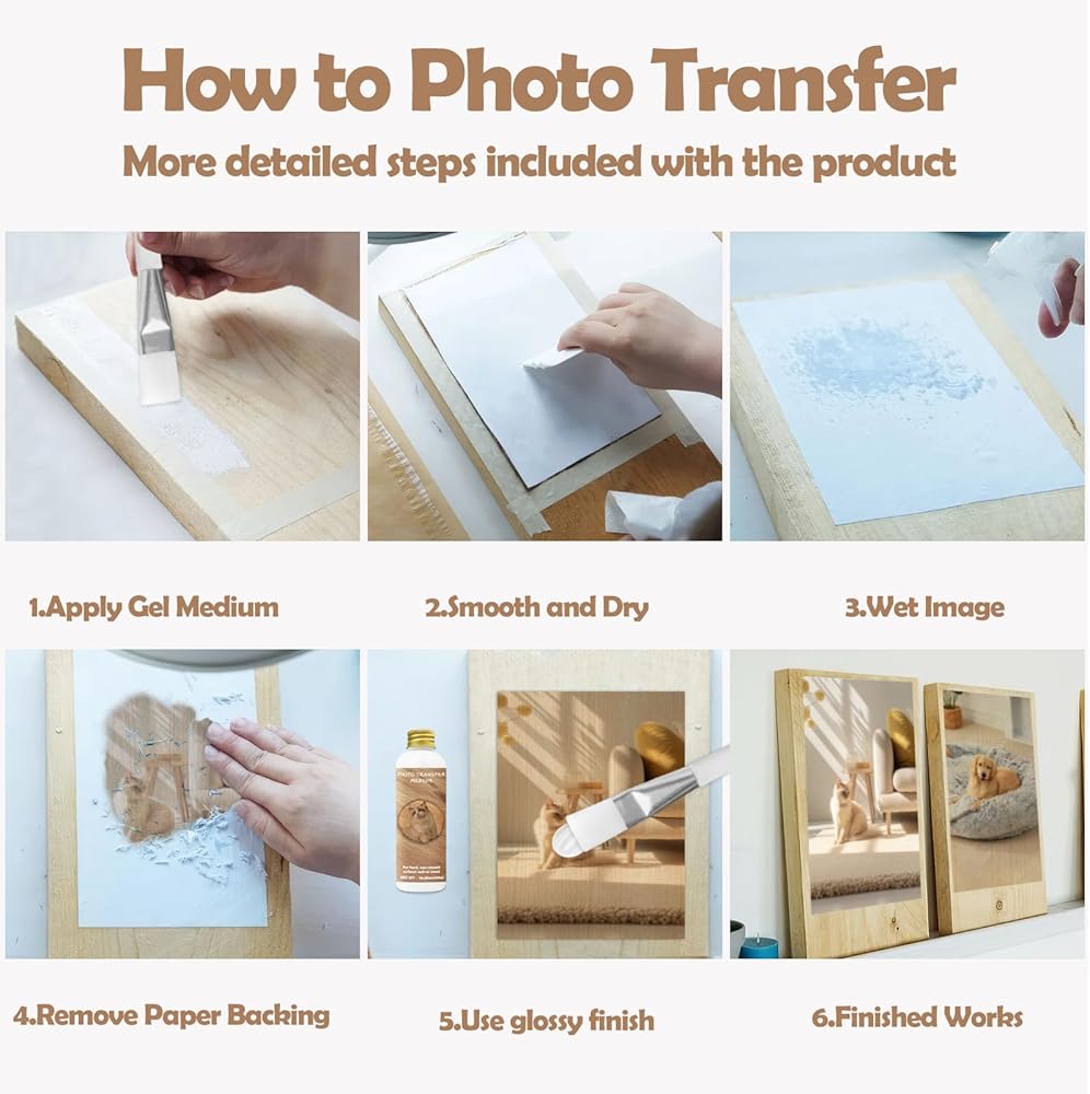 • Gel Medium for Photo Transfer: This photo transfer media allows for vivid color or black and white images printed on paper to be transferred onto the surface of wooden boards and other objects, maintaining clarity and detail. Easily turn your photos into beautiful home decoration
