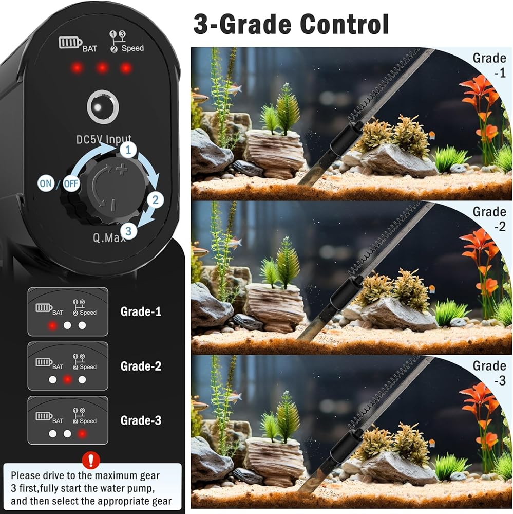 🌀【تحكم في 3 درجات】قوة شفط قابلة للتعديل، يوصى بتشغيلها على الترس الثالث (أقصى ترس)، وتشغيل مضخة المياه بالكامل، ثم ضبطها. وحدة التحكم مجهزة بمشابك عرض قابلة للتعديل، يمكن تثبيتها على حوض السمك عن طريق ضبط العرض، حرر يديك.