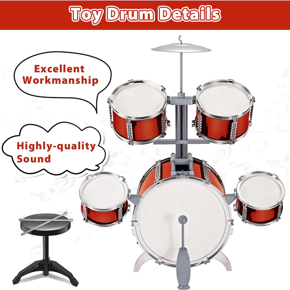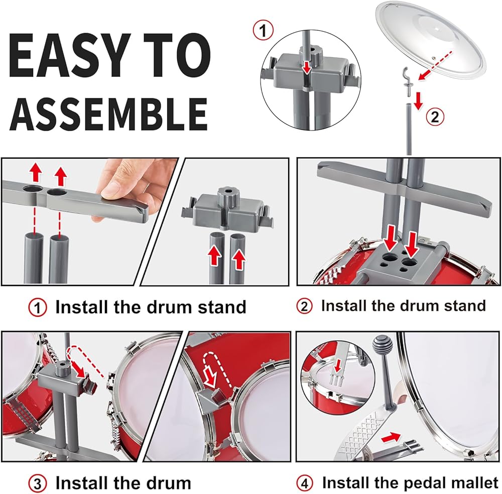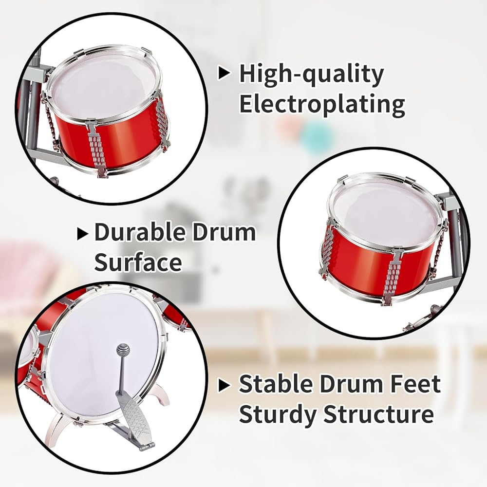 The bass drum, with a diameter of 13.3 inches , provides a deep, resonant sound. The medium drums, each 7.6 inches in diameter, offer rich mid-range tones, while the two snare drums, at 6.3 inches in diameter, deliver sharp, crisp sounds. This drum set for kids age 5-7 create a full and dynamic range of sounds that are perfect for young drummers to explore.