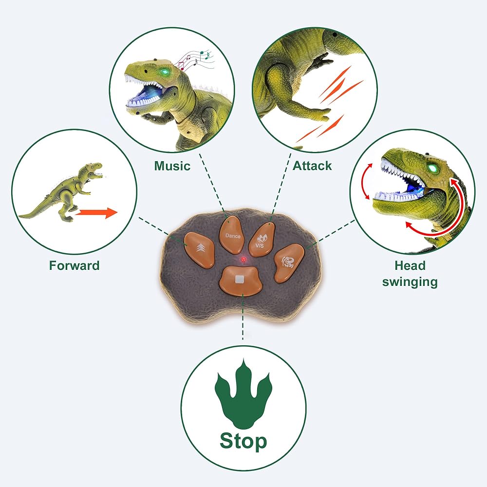• متعة | خذ المتعة أثناء التنقل! من السهل حمل الديناصورات وجهاز التحكم عن بعد حتى تتمكن من جلب المرح معك في أي مكان تذهب إليه مما يضمن أن المتعة ليست مقيدة بأي قيود ويمكن الاستمتاع بها في أي وقت وفي أي مكان. اجعل الديناصور يعزف الموسيقى، أو يتحرك للأمام، أو يؤرجح رأسه بجهاز التحكم عن بعد واستمتع بالترفيه في مغامراته.
