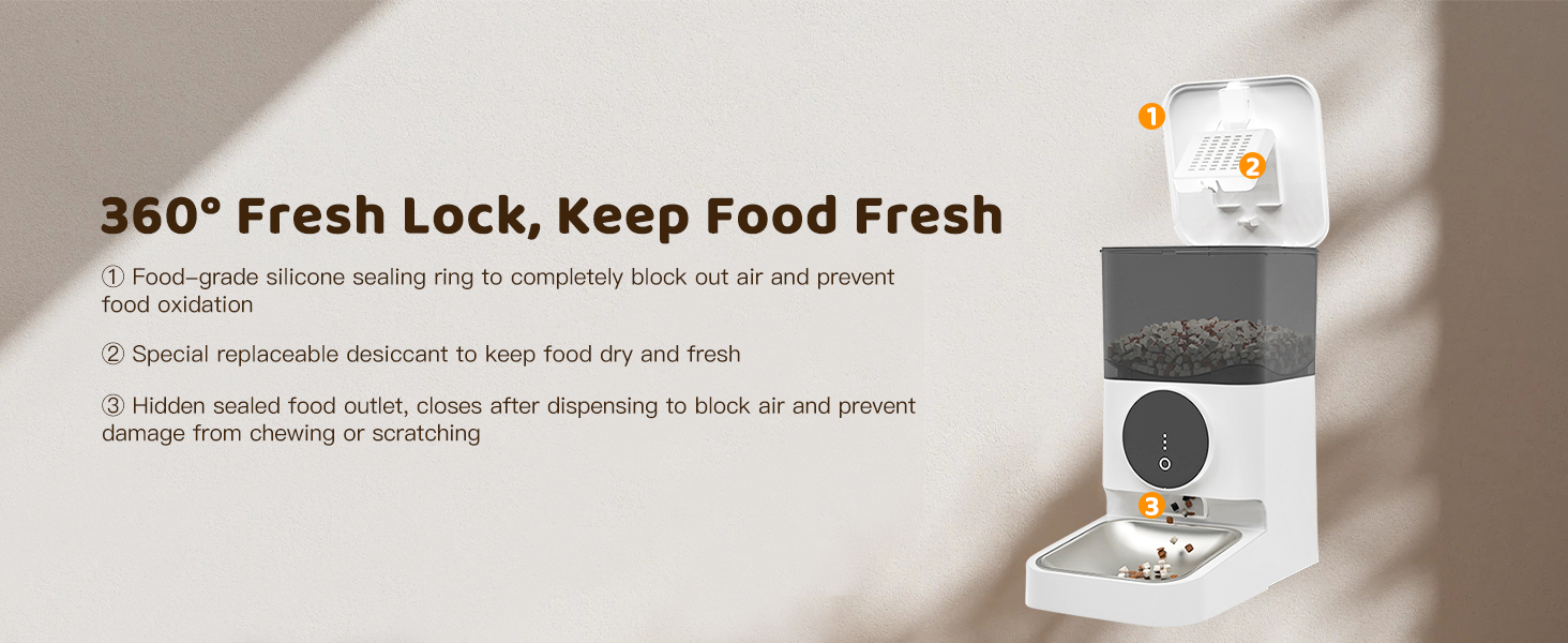 منفذ مضاد للانحشار بتصميم محكم الغلق: يتميز المنفذ المخفي بتصميم محكم الغلق ومضاد للانحشار يمنع انسداد الطعام ويضمن التوزيع السلس. يتم إغلاق منفذ الطعام تلقائيًا بعد التوزيع للحفاظ على طعام حيوانك الأليف طازجًا وآمنًا، مما يقلل من التعرض للهواء ويمنع تناول الوجبات الخفيفة بين الوجبات.