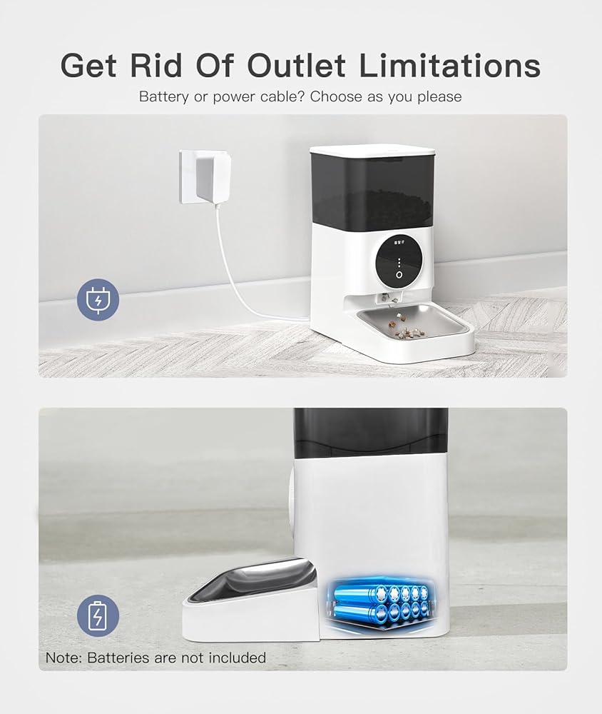 مصدر طاقة مزدوج للتشغيل دون انقطاع: استخدم إما كابل طاقة أو بطارية لتشغيل مرن وموثوق. حتى أثناء انقطاع الطاقة، تضمن البطارية الاحتياطية استمرار تغذية حيوانك الأليف في الوقت المحدد (البطاريات غير متضمنة)، لذلك لن تقلق أبدًا بشأن تفويت الوجبات