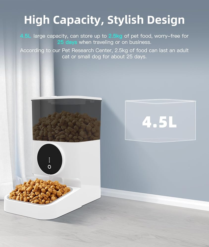 سعة كبيرة تبلغ 4.5 لتر لتغذية خالية من المتاعب: مع حاوية طعام كبيرة سعة 4.5 لتر، يمكن لجهاز التغذية الأوتوماتيكي هذا تخزين ما يصل إلى 2.5 كجم من طعام الحيوانات الأليفة، مما يوفر لقطتك أو كلبك الصغير وجبات كافية لمدة تصل إلى 25 يومًا. عندما تكون في رحلات أو بعيدًا عن المنزل، تضمن عدم جوع حيوانك الأليف أبدًا