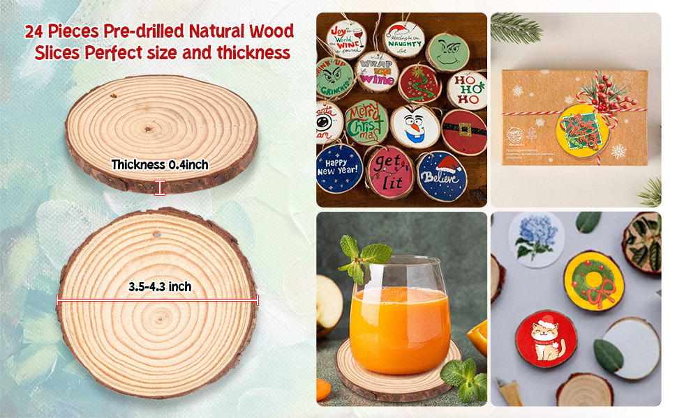 شرائح الخشب الطبيعي لعيد الميلاد، 24 قطعة 3.5-4.3 بوصة مجموعة زخارف شرائح الخشب الطبيعي غير المكتملة مع أقواس عيد الميلاد، خرز خشبي، خيوط الجوت، مشغولات يدوية خشبية لعيد الميلاد للأطفال البالغين