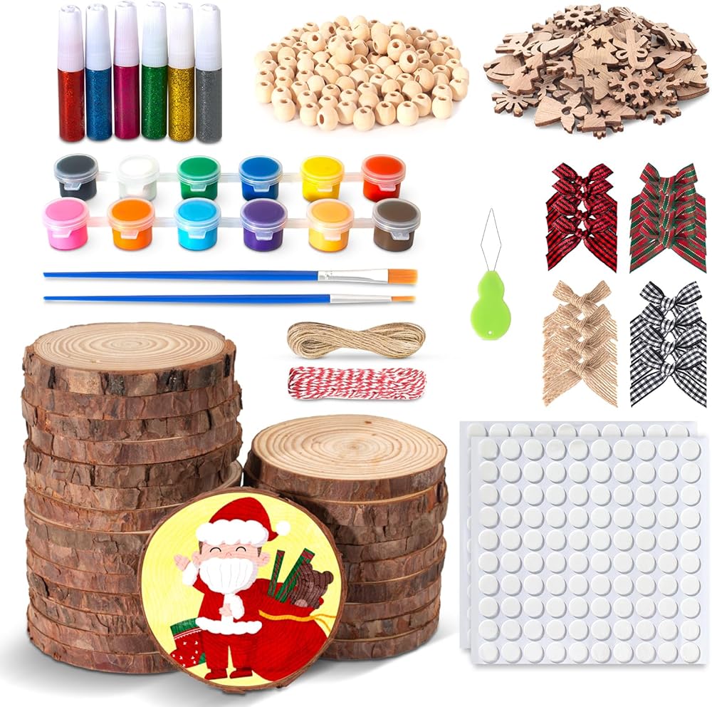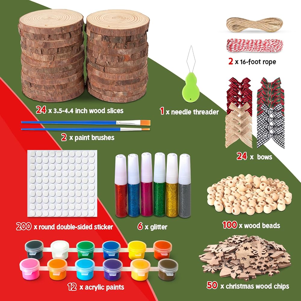 مجموعة شرائح خشبية كاملة لعيد الميلاد: تحتوي مجموعة شرائح الخشب على كل ما تحتاجه لإنشاء ديكورات خشبية، بما في ذلك 24 شريحة خشب طبيعي بقطر 3.5-4.3 بوصة وسمك 0.4 بوصة، و24 قوس عيد الميلاد، و100 خرزة خشبية، وحبل بطول 32 قدمًا، 12 طلاء أكريليك، 2 فرشة طلاء، 6 مادة لامعة، 2 ملصق على الوجهين، 7 أنواع من رقائق خشب عيد الميلاد (رقاقات الثلج، أشجار عيد الميلاد، قبعات عيد الميلاد، عصي عيد الميلاد، الأيائل، جوارب عيد الميلاد، الملائكة)، خيط الإبرة