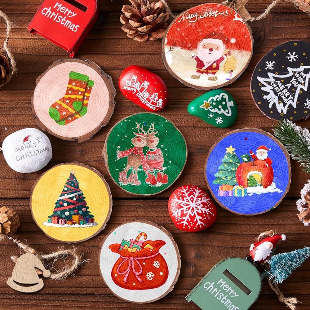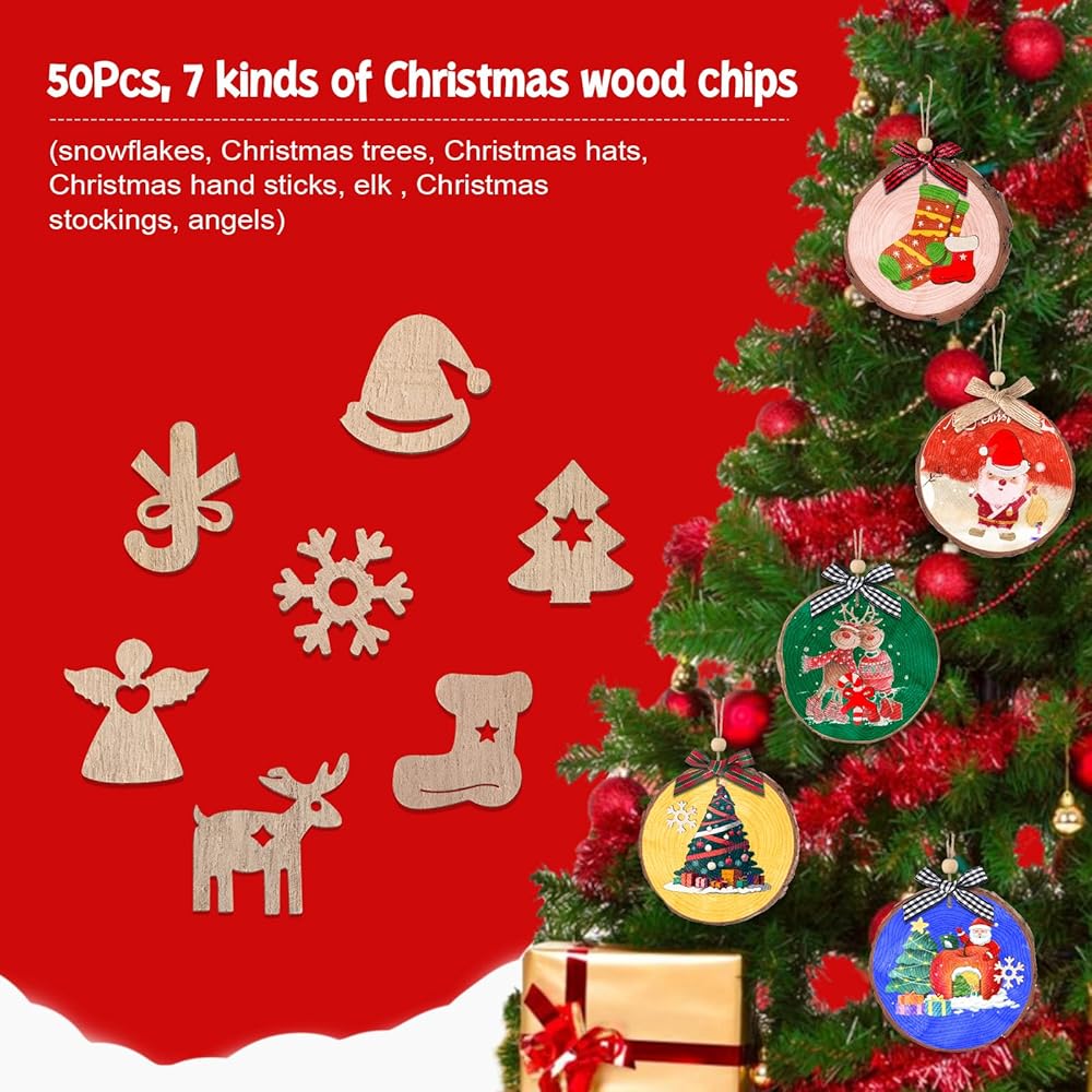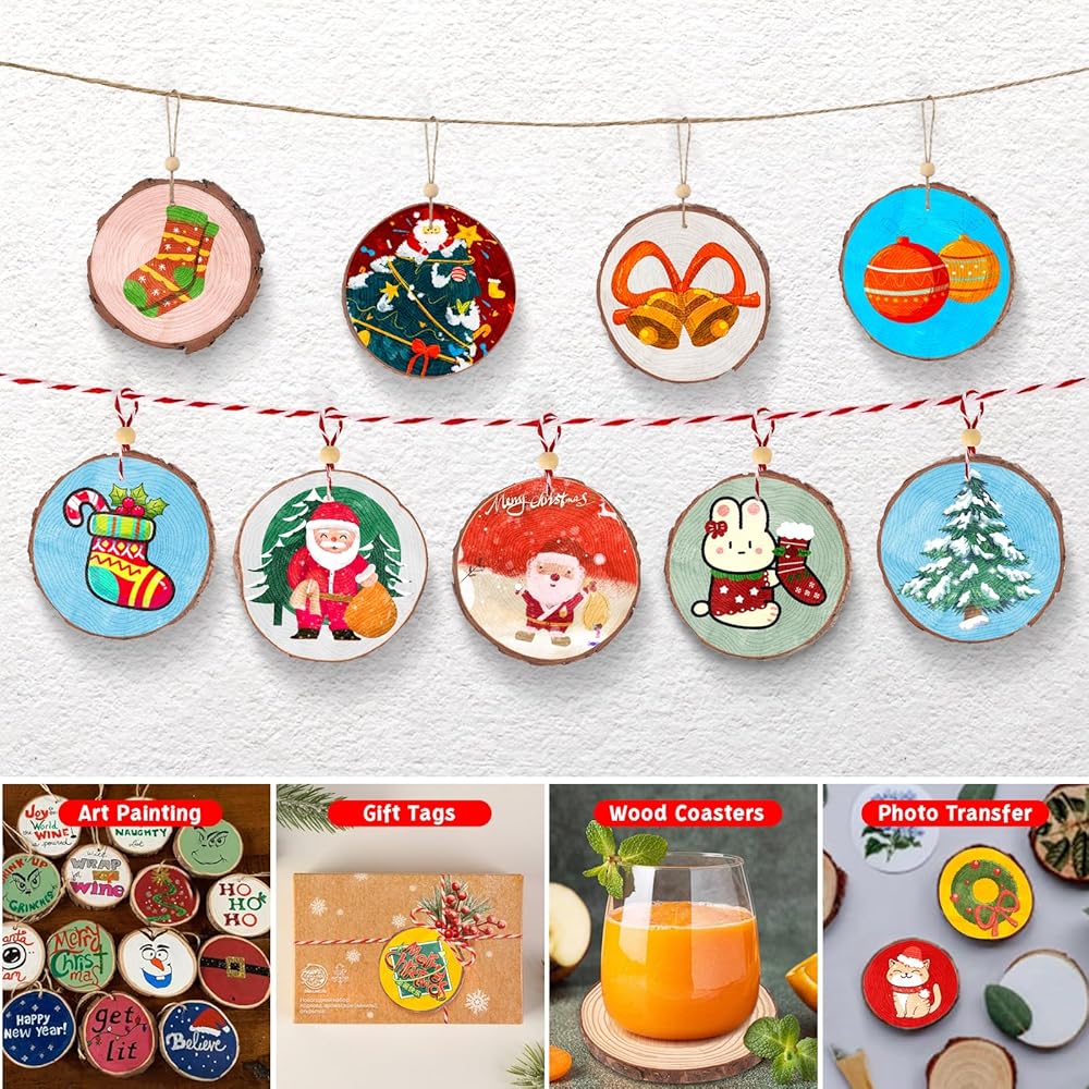 زينة عيد الميلاد القابلة للتخصيص: توفر مجموعة شرائح الخشب الطبيعي لدينا ملصقات على الوجهين، مما يسمح لك بلصق أقواس عيد الميلاد ورقائق خشب عيد الميلاد المختلفة على الأنماط المرسومة يدويًا لتندمج مع لوحاتك الإبداعية. كل شريحة خشب عبارة عن لوحة قماشية تنتظر التزيين، وكل قطعة يمكن أن تكون أبرز ذكريات عطلتك. هذه الشرائح الخشبية هي الخيار الأمثل لعرض زينة عيد الميلاد الشخصية الخاصة بك