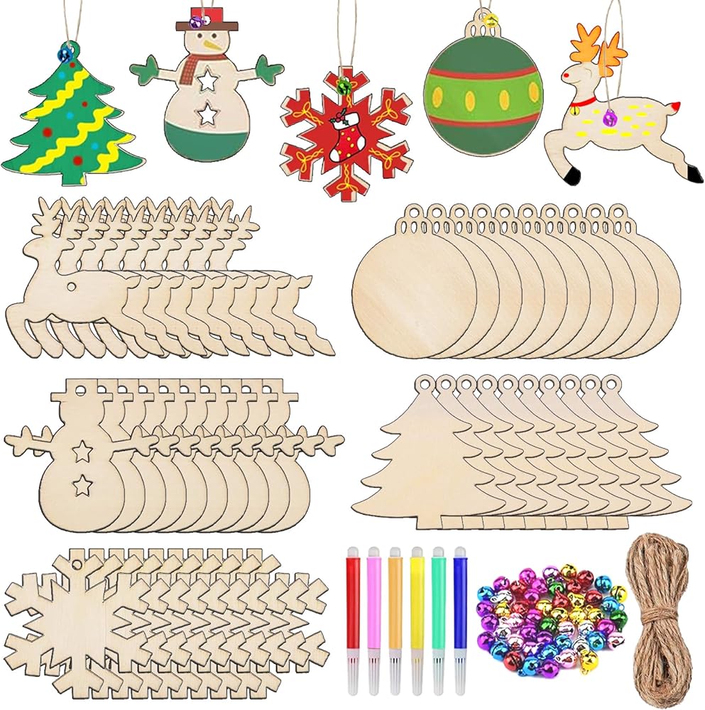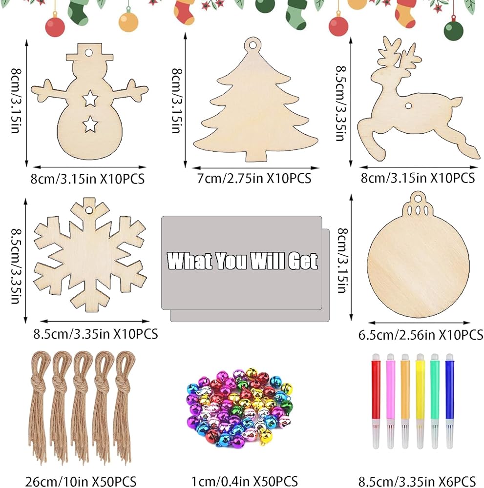 50 Pcs Unfinished Wooden Christmas Ornaments: Complete wooden Christmas ornaments unfinished kit includes 50pcs wooden slices (5 styles, each 10 pcs, Christmas tree, snowman, reindeer, blank wooden circle, snowflake), 50 pcs ropes, 50 colorful bells, 6 colorful pens; unique christmas decorations bring more fun and warm for your Christmas.