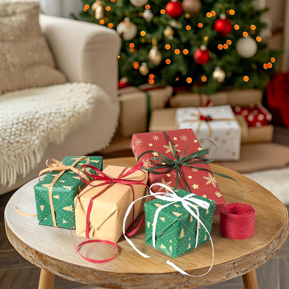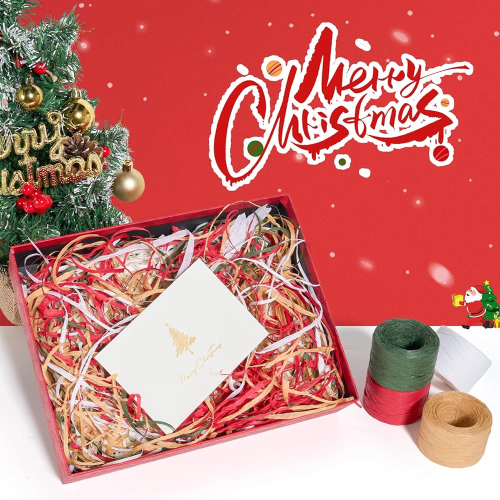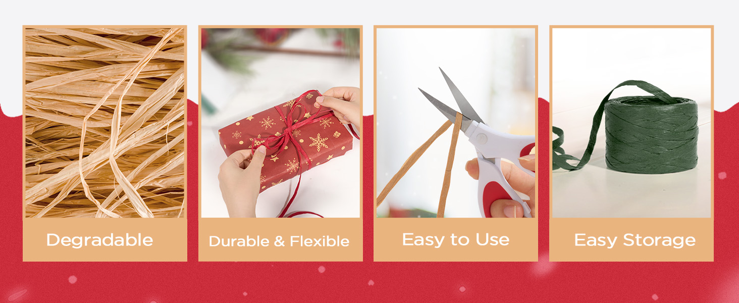 تطبيق واسع: شريط الرافية متعدد الاستخدامات لعيد الميلاد والعطلات الأخرى. مثالية لتغليف الهدايا والسلع المخبوزة، والنسيج، وبطاقة التعليق، والمشروعات اليدوية والفنية، وديكور الحفلات، وحشو الصناديق، وإضافة لمسة احتفالية لمنزلك.