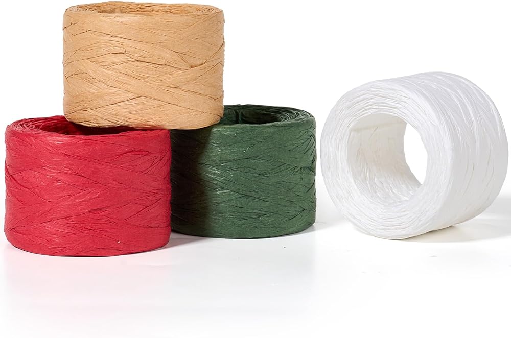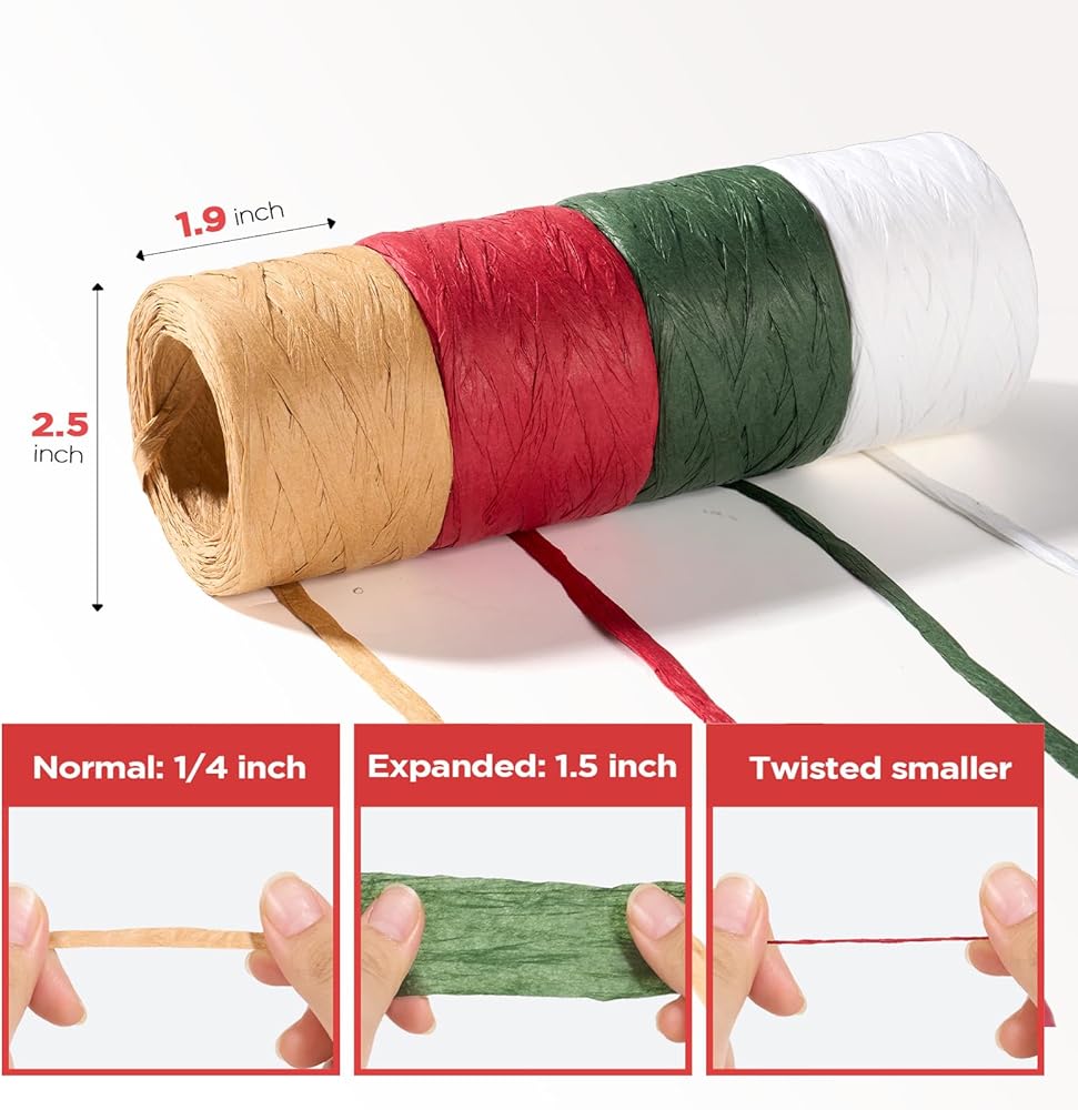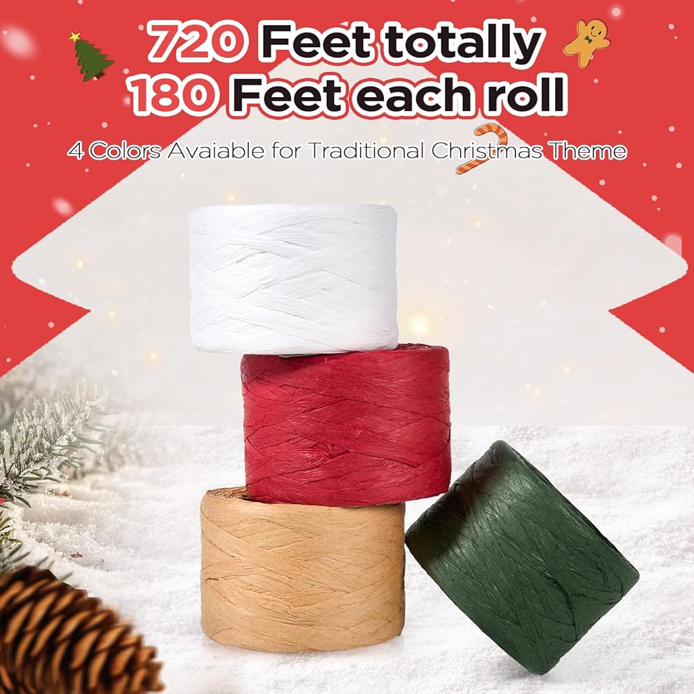 Sooez 4 لفات من خيوط شريط الرافية، ورق تغليف عيد الميلاد بطول 720 قدمًا للحرف اليدوية، شريط عيد الميلاد باللون الأحمر والأخضر والأبيض الطبيعي لتغليف الهدايا، غزل الرافية لإمدادات العطلات بنفسك، 180 قدمًا لكل لفة