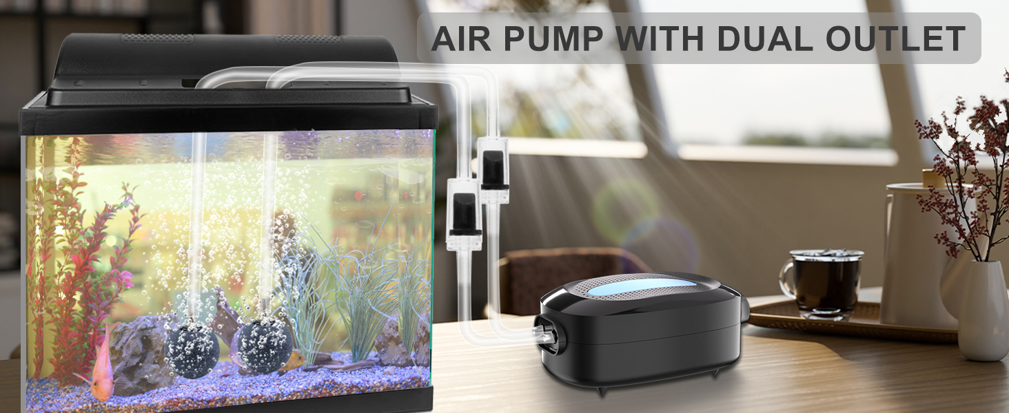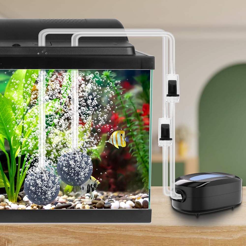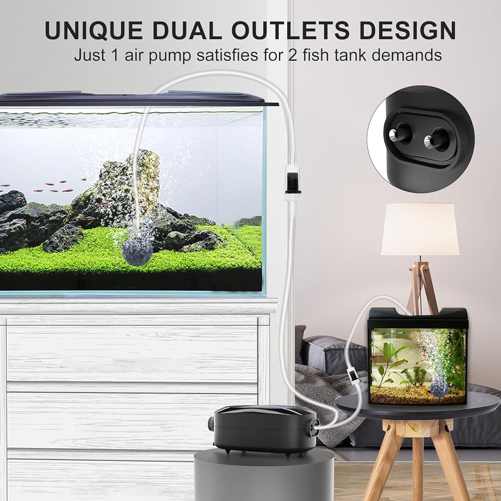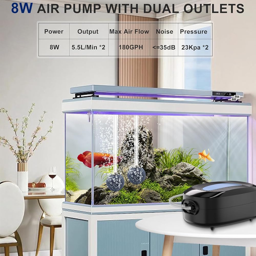 💦 𝗚𝗲𝗻𝗲𝗿𝗮𝘁𝗲 𝗖𝗼𝗻𝘁𝗶𝗻𝘂𝗼𝘂𝘀 𝗥𝗶𝗰𝗵 𝗕𝘂𝗯𝗯𝗹𝗲𝘀 - تأتي فقاعات حوض السمك المطورة بقدرة 8 واط مع منفذي هواء، وتنتج فقاعات وفيرة من معظم مضخات هواء حوض السمك الصغيرة الأخرى. 2 حجر هواء دائري كبير يطلق فقاعات الهواء الدقيقة بالكامل، وذلك لتحسين محتوى الأكسجين في الماء، والحفاظ على بيئة معيشة جيدة للأسماك. مضخة هواء قوية لخزان الأسماك بقدرة 8 وات تتميز بضغط هواء قوي، وتدفق هواء كبير، والحد الأقصى لتدفق الهواء يصل إلى 180 جيجا في الساعة.