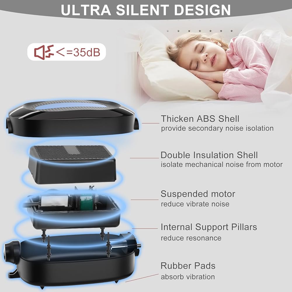 🐟 𝗠𝘂𝗹𝘁𝗶 𝗟𝗮𝘆𝗲𝗿 𝗗𝗲𝘀𝗶𝗴𝗻 𝗳𝗼𝗿 𝗦𝗶𝗹𝗲𝗻𝗰𝗲 - مع 4 أقدام من السيليكون لامتصاص الصدمات، وغطاء عازل مزدوج، ومحرك معلق وغطاء ABS سميك لعزل الصوت، فقاعات خزان الأسماك هذه أكثر هدوءًا من مضخة الهواء الأخرى. بالكاد يمكنك سماع ضجيج المحرك، فقط صوت الفقاعات الناعمة عندما تعمل مضخة الأكسجين.