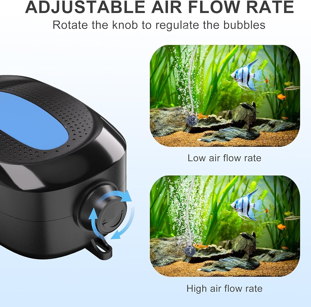 🐠 𝗔𝗱𝗷𝘂𝘀𝘁𝗮𝗯𝗹𝗲 𝗔𝗶𝗿 𝗣𝘂𝗺𝗽 𝗞𝗻𝗼𝗯 - باستخدام مقبض التحكم في الضبط، يمكن تعديل تدفق الهواء وفقًا لتفضيلاتك الخاصة، حتى 180 جيجا في الساعة. ويستخدم الهواء في اهتزاز فقاعات الهواء لزيادة مساحة اتصال الماء بالهواء، حتى يتمكن الماء من إذابة الأكسجين، وبالتالي زيادة محتوى الأكسجين في الماء.