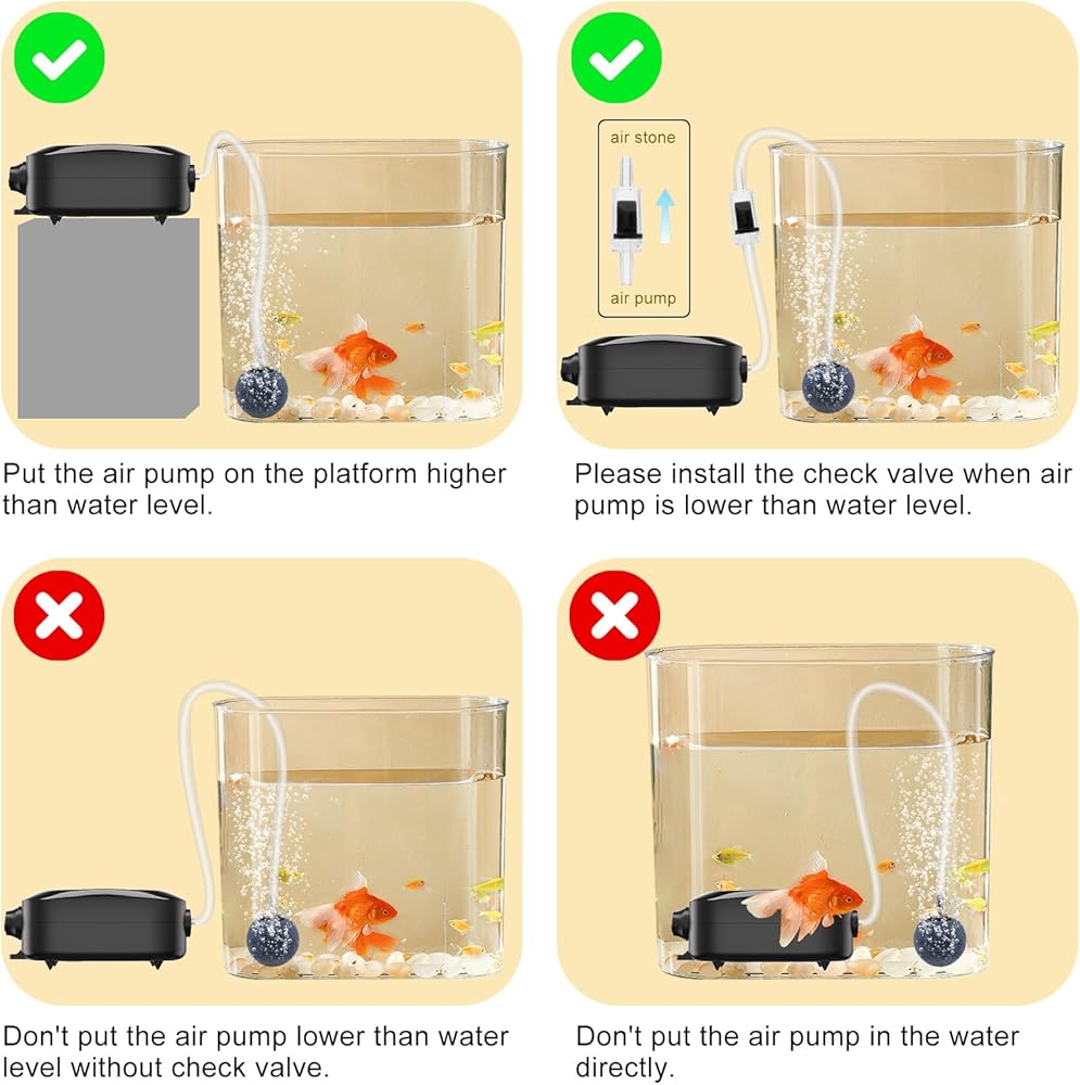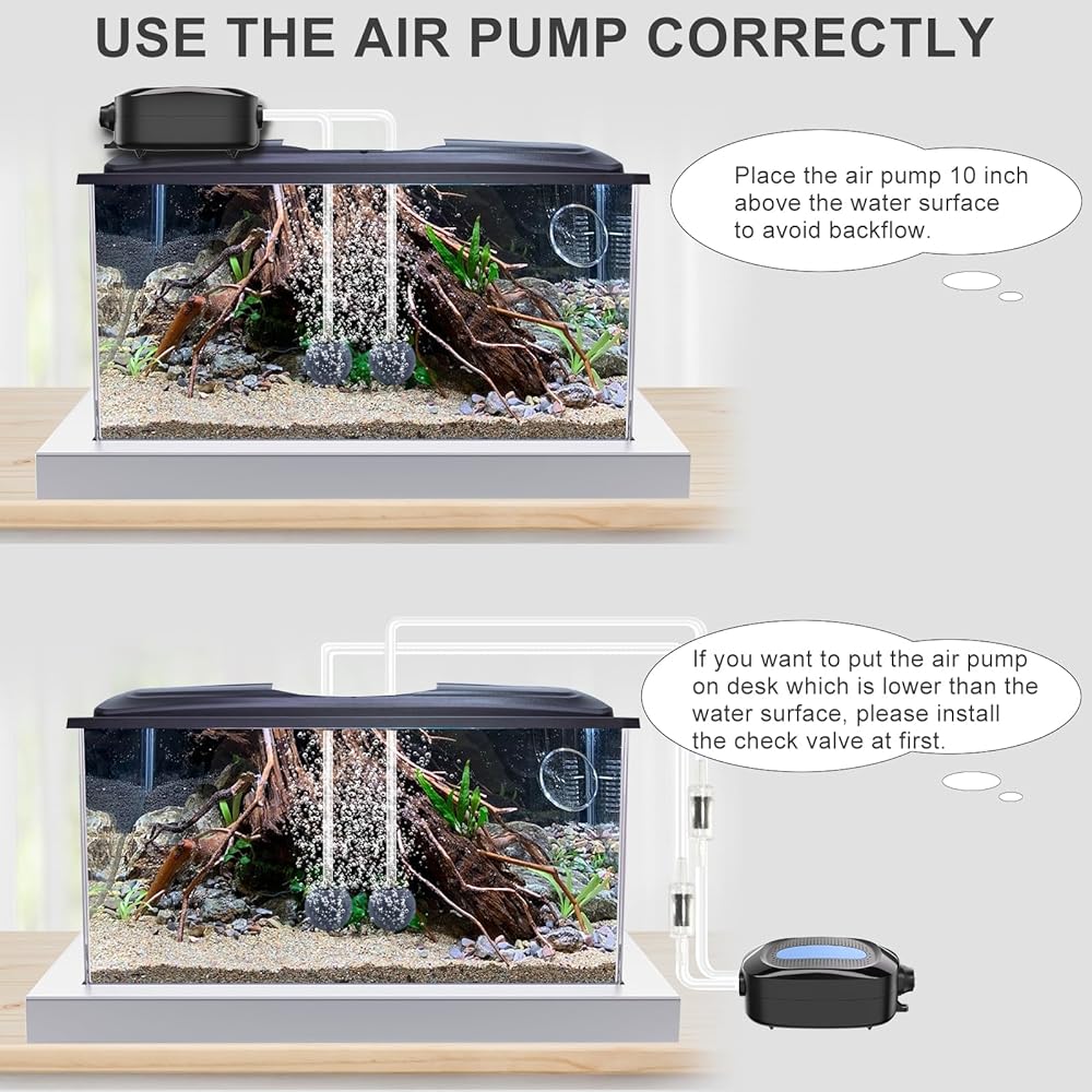 🐡𝗦𝗽𝗲𝗰𝗶𝗮𝗹 𝗖𝗵𝗲𝗰𝗸 𝗩𝗮𝗹𝘃𝗲 𝗗𝗲𝘀𝗶𝗴𝗻 - فقاعات الهواء في حوض السمك مجهزة بصمام فحص تدفق المياه الفريد، الذي يمكنه يمكن تعديلها للتأكد من أن مضخة الأكسجين في حوض السمك أو خزان الأسماك تحافظ على ضغط الهواء وتدفق الهواء بشكل ثابت. يرجى ملاحظة: ① يرجى وضع مضخة الهواء أعلى بحوالي 25 سم (10 بوصات) من مستوى الماء لتجنب تدفق المياه العكسي؛ ②إذا كنت بحاجة إلى وضع مضخة الهواء تحت مستوى الماء، يرجى التأكد من استخدام صمام الفحص لمنع تدفق المياه إلى الخلف.