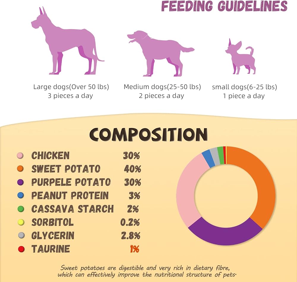 طبيعة مضادة للحساسية: البطاطا الحلوة المغلفة بالبط والبطاطا الحلوة الأرجوانية لا تسبب الحساسية، ومناسبة للكلاب التي تعاني من حساسية الطعام أو حساسية تجاه البروتينات الشائعة مثل الدجاج أو اللحم البقري.