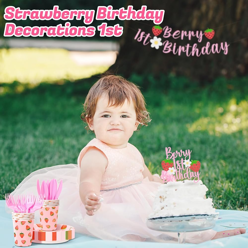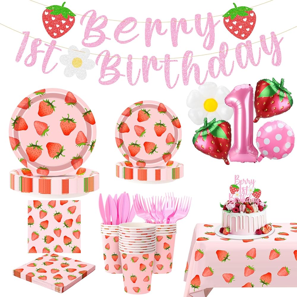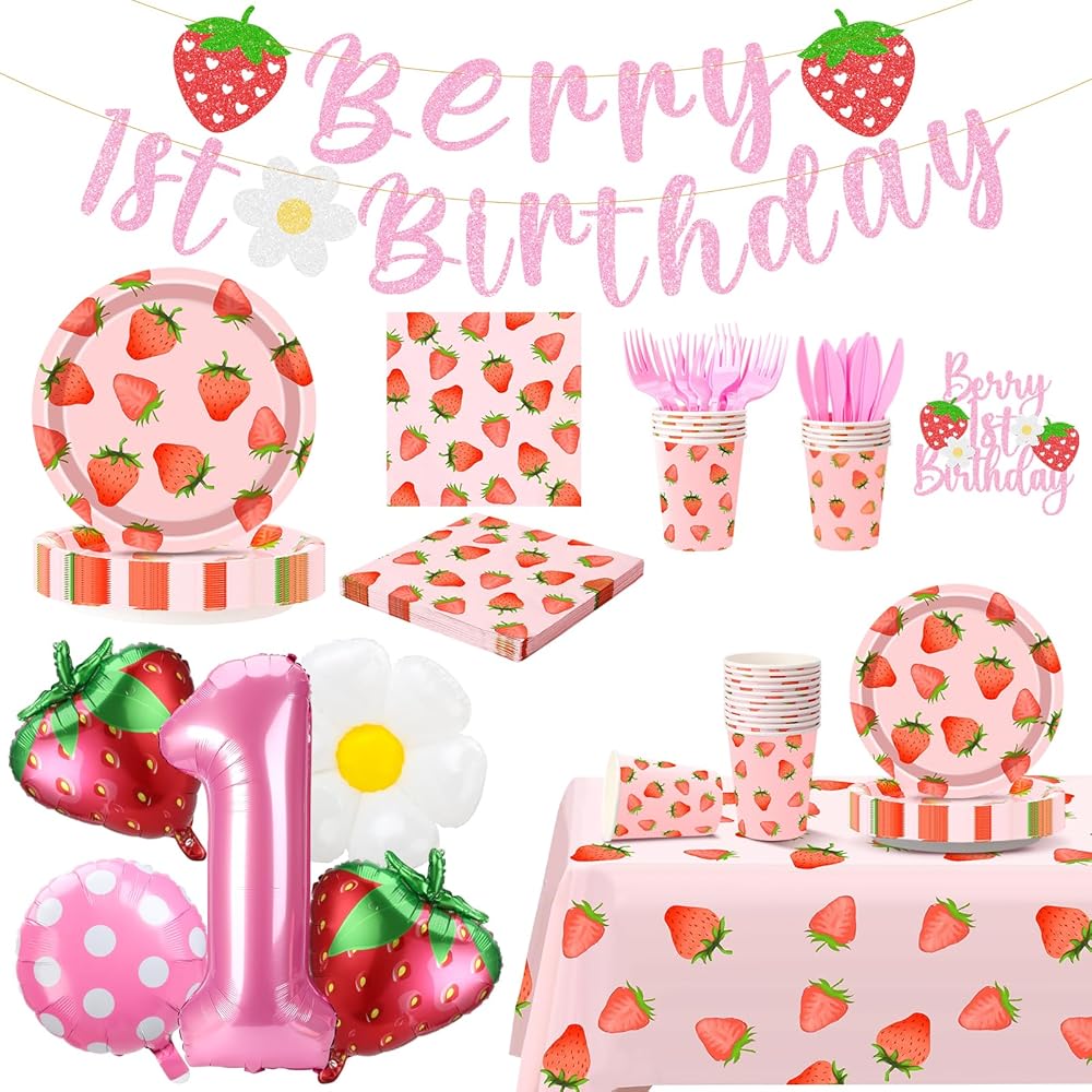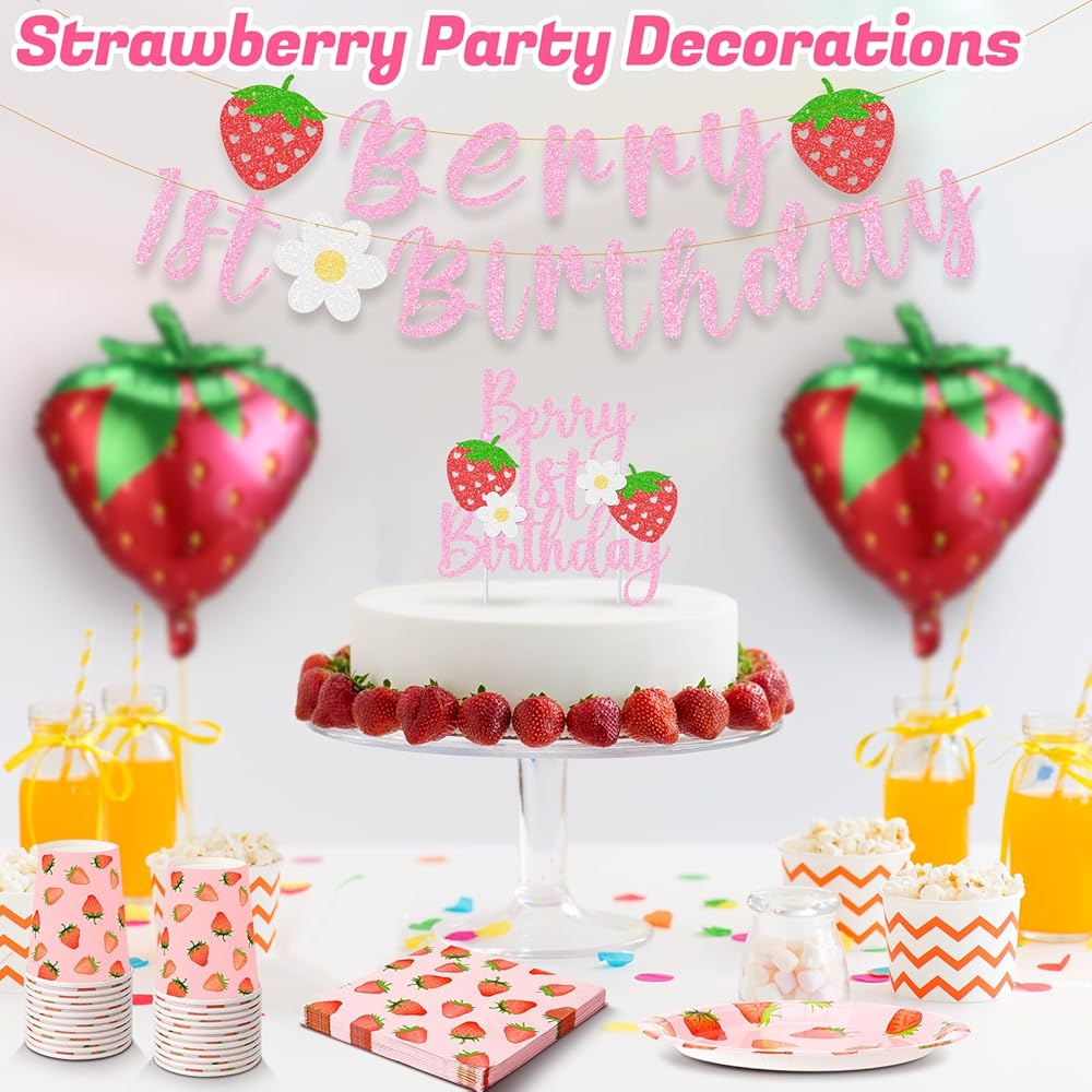 ديكور حفلات الفراولة: تصميم ديكورات حفلات عيد الميلاد الأول لدينا بنمط فراولة لطيف، قم بتزيين حفلة عيد ميلاد طفلك الأول واخلق ذكريات لا تنسى مع مجموعات حفلات الفراولة هذه